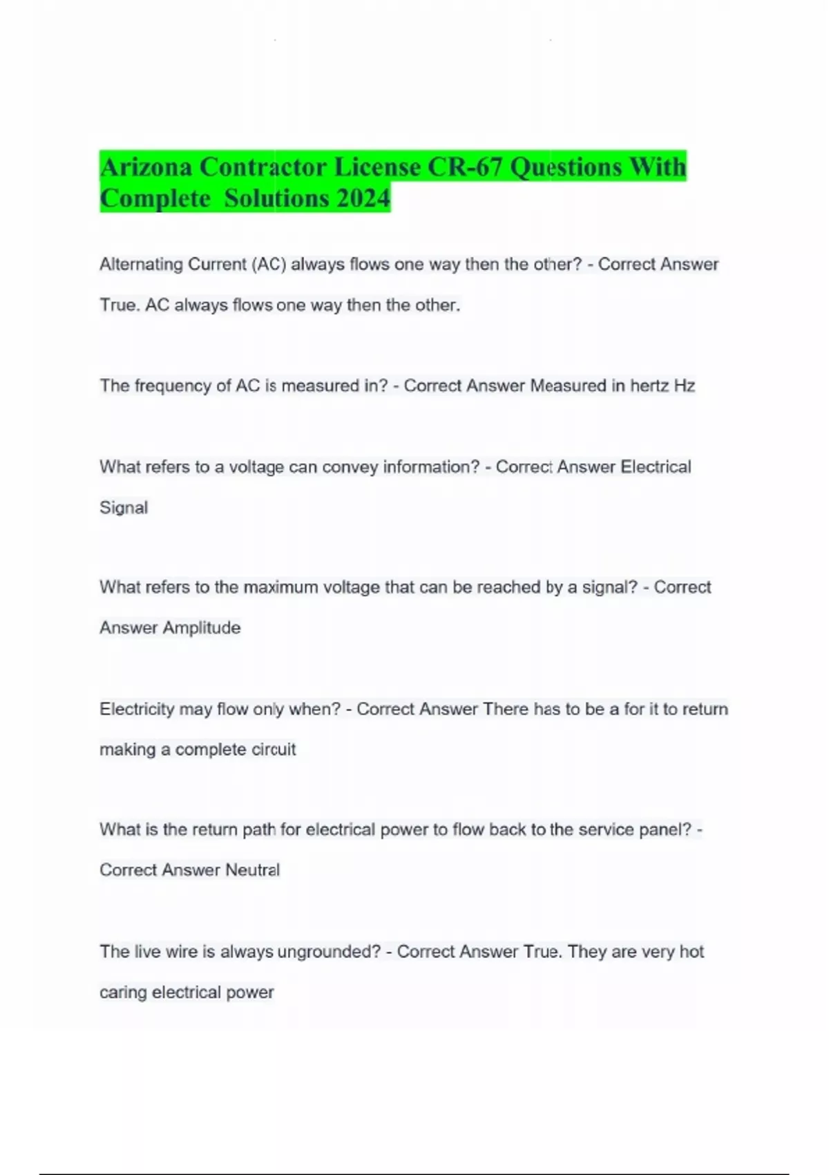 Arizona Contractor License CR-67 Questions With Complete Solutions 2024 Alternating Current (AC) always flows one way then the other? - Correct Answer True. AC always flows one way then the other. The frequency of AC is measured in? - Correct Answer Measured in hertz Hz What refers to a voltage can convey information? - Correct Answer Electrical Signal What refers to the maximum voltage that can be reached by a signal? - Correct Answer Amplitude Electricity may flow only when? - Correct Answer There has to be a for it to return making a complete circuit What is the return path for electrical power to flow back to the service panel? - Correct Answer Neutral The live wire is always ungrounded? - Correct Answer True. They are very hot caring electrical power