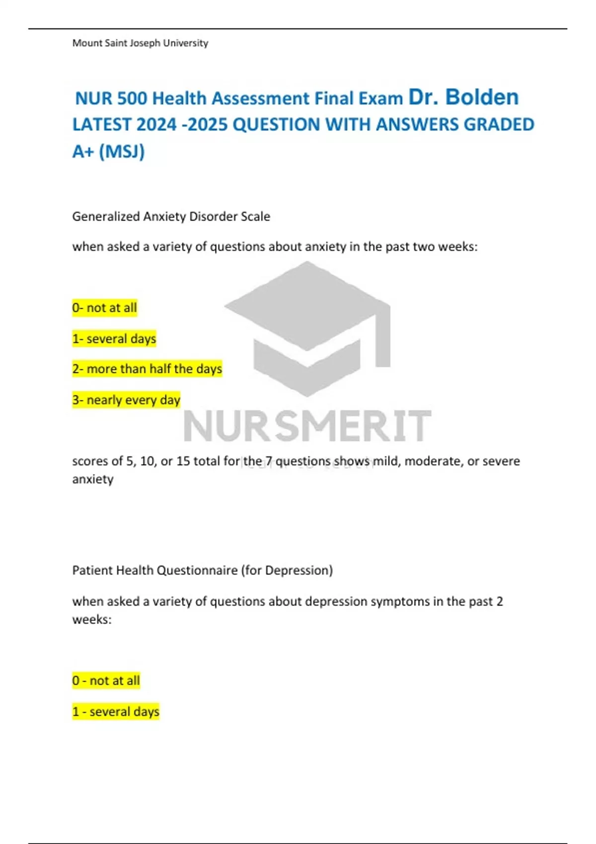 NUR 500 Health Assessment Final Exam Dr. Bolden LATEST QUESTION WITH ANSWERS GRADED A+ (MSJ)