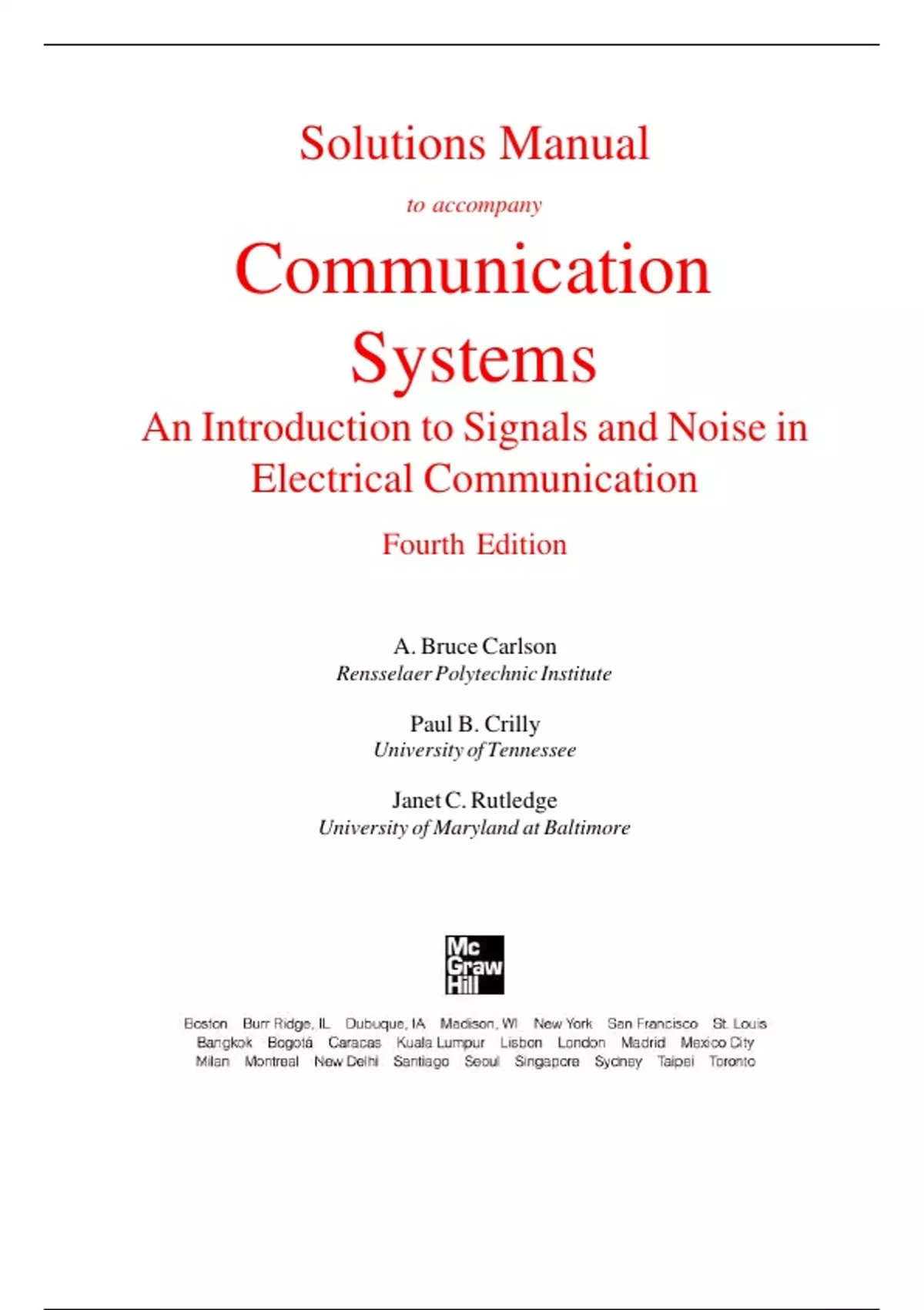 Facilitate your understanding and learning with this comprehensive Solutions Manual for "Communication Systems: An Introduction to Signals and Noise in Electrical Communication, 4th Edition." This manual provides detailed solutions to the end-of-chapter problems and exercises found in the textbook. Key Features: Comprehensive Solutions: Detailed solutions to problems covering various aspects of communication systems, signals, and noise. Step-by-Step Explanations: Clear explanations that help you understand the concepts and methods used in solving each problem. Concept Reinforcement: Reinforce your understanding of signal processing, modulation techniques, noise, and their applications in communication systems. Aligned with the Textbook: Solutions are aligned with the 4th edition of the textbook, ensuring accuracy and relevance. This Solutions Manual is an essential companion for students studying communication systems and professionals looking to deepen their understanding of signal processing and electrical communication concepts.