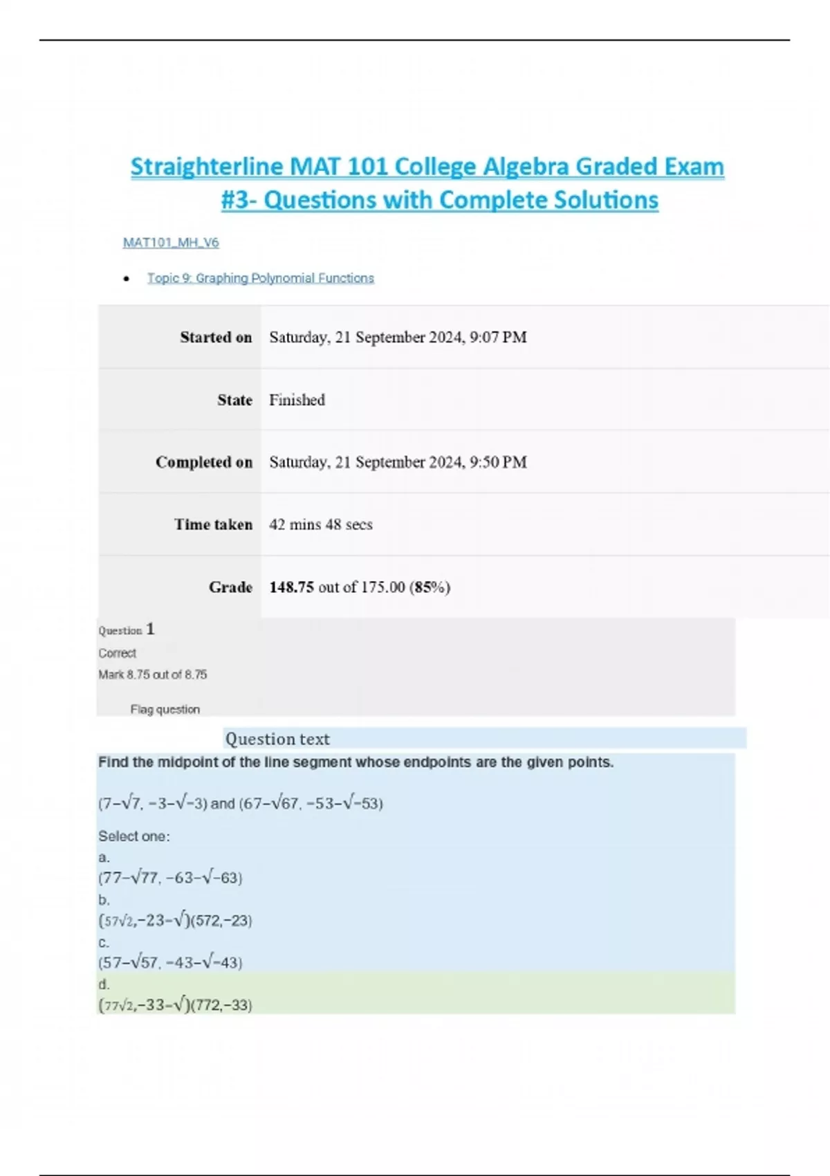 straighterline mat 101 college algebra graded exam