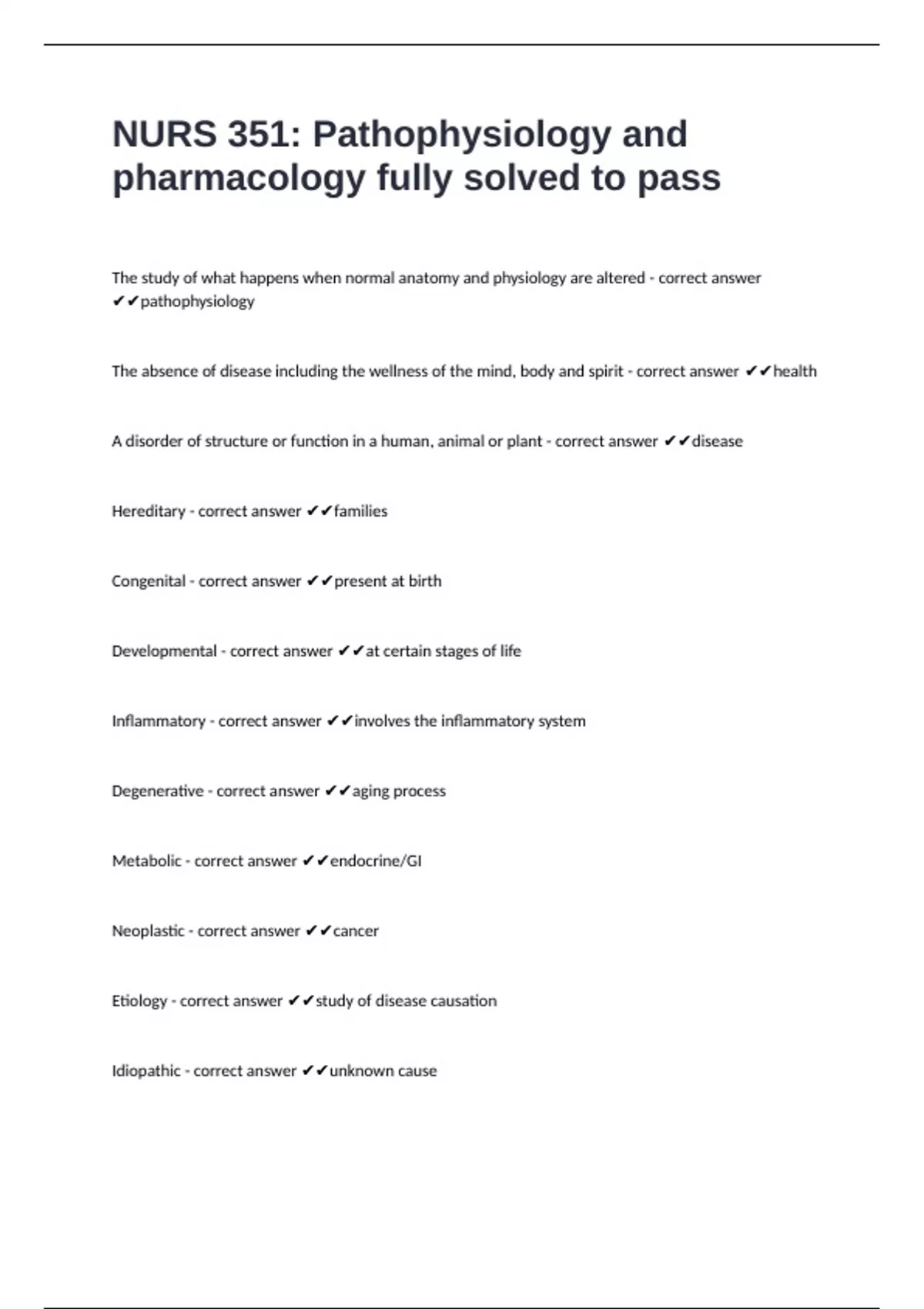 NURS 351: Pathophysiology and pharmacology fully solved to pass