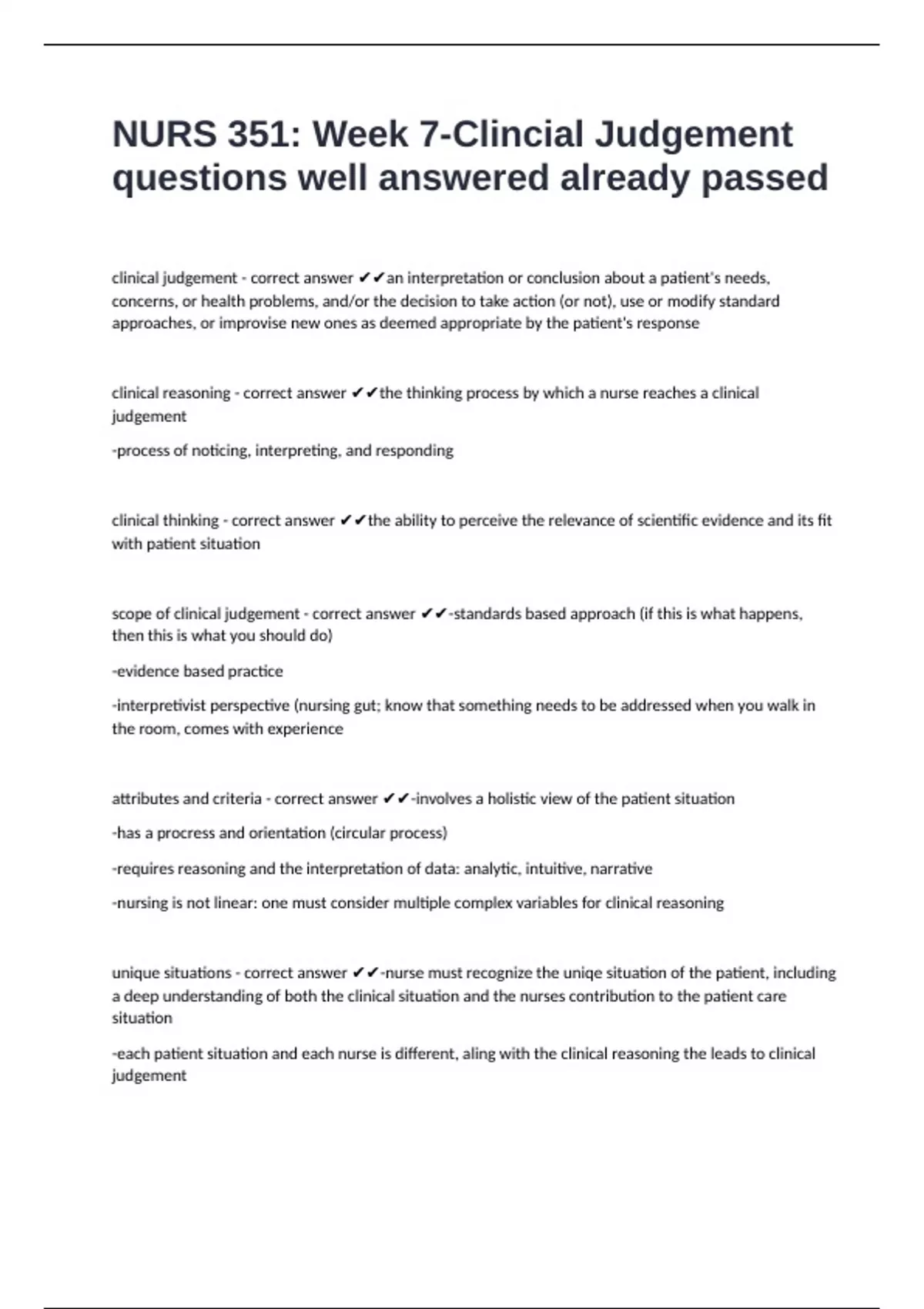 NURS 351: Week 7-Clincial Judgement questions well answered already passed