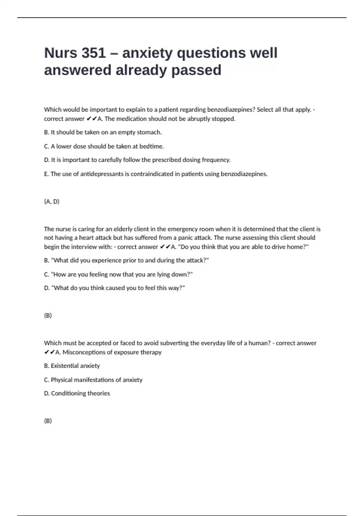 Nurs 351 – anxiety questions well answered already passed