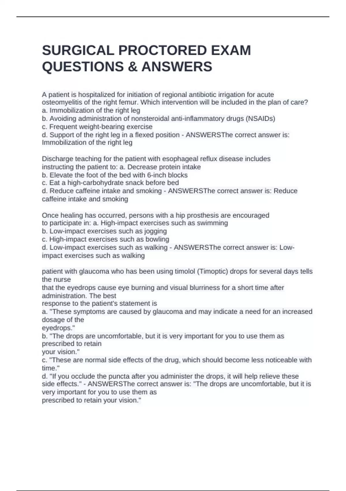 A patient is hospitalized for initiation of regional antibiotic irrigation for acute osteomyelitis of the right femur. Which intervention will be included in the plan of care? a. Immobilization of the right leg b. Avoiding administration of nonsteroidal anti-inflammatory drugs (NSAIDs) c. Frequent weight-bearing exercise d. Support of the right leg in a flexed position - ANSWERSThe correct answer is: Immobilization of the right leg Discharge teaching for the patient with esophageal reflux disease includes instructing the patient to: a. Decrease protein intake b. Elevate the foot of the bed with 6-inch blocks c. Eat a high-carbohydrate snack before bed d. Reduce caffeine intake and smoking - ANSWERSThe correct answer is: Reduce caffeine intake and smoking Once healing has occurred, persons with a hip prosthesis are encouraged to participate in: a. High-impact exercises such as swimming b. Low-impact exercises such as jogging c. High-impact exercises such as bowling d. Low-impact exercises such as walking - ANSWERSThe correct answer is: Low-impact exercises such as walking patient with glaucoma who has been using timolol (Timoptic) drops for several days tells the nurse that the eyedrops cause eye burning and visual blurriness for a short time after administration. The best response to the patient's statement is a. "These symptoms are caused by glaucoma and may indicate a need for an increased dosage of the eyedrops." b. "The drops are uncomfortable, but it is very important for you to use them as prescribed to retain your vision." c. "These are normal side effects of the drug, which should become less noticeable with time." d. "If you occlude the puncta after you administer the drops, it will help relieve these side effects." - ANSWERSThe correct answer is: "The drops are uncomfortable, but it is very important for you to use them as prescribed to retain your vision." Patients should be taught that Zollinger-Ellison syndrome is: a. An ulcerative syndrome caused by a gastrinoma b. An infectious syndrome caused by Helicobacter pylori c. Related to the indiscriminate use of nonsteroidal antiinflammatory drugs (NSAIDs) d. A type of peptic ulcer related to stress - ANSWERSThe correct answer is: An ulcerative syndrome caused by a gastrinoma After a patient has a short-arm plaster cast applied in the emergency department, which statement by the patient indicates a good understanding of the nurse's discharge teaching? a. "I can use a cotton-tipped applicator to rub lotion on any dry areas under the cast." b. "I should avoid moving my fingers and elbow until the cast is removed." c. "I can get the cast wet as long as I dry it right away with a hair dryer." d. "I will apply an ice pack to the cast over the fracture site for the next 24 hours." - ANSWERSThe correct answer is: "I will apply an ice pack to the cast over the fracture site for the next 24 hours." The leading cause of blindness in the elderly is: a. Glaucoma b. Macular degeneration c. Ocular tumors d. Retinal detachment - ANSWERSThe correct answer is: Macular degeneration Which describes a fracture located at a 45-degree angle to the long axis of bone? a. Oblique fracture b. Impacted fracture c. Avulsion fracture d. Compound fracture - ANSWERSThe correct answer is: Oblique fracture Dumping syndrome after gastric surgery: a. Can be controlled by increasing fluid ingestion b. Produces a sudden decrease in blood glucose, initiating gastric emptying c. Is caused by rapid emptying of hypertonic chyme into the jejunum d. Is treated most effectively with a high-cholesterol, low-fat diet and fluid restriction - ANSWERSThe correct answer is: Is caused by rapid emptying of hypertonic chyme into the jejunum When performing an eye examination, the nurse will assess for accommodation by a. observing the pupils when the patient focuses on a close object and then on a distant object. b. shining a light into the patient's eye and watching the pupil response in the opposite eye. c. touching the patient's pupil with a small piece of sterile cotton and watching for a blink reaction. d. covering one eye for 1 minute and noting the pupil reaction when the cover is removed. - ANSWERSAccommodation is defined as the ability of the lens to adjust to various distances. Which is classic indication of hip fracture? a. Internal rotation of the injured leg b. Shortening and external rotation of the injured leg c. Groin pain accompanied by urinary retention d. Absence of pedal pulses on the affected side - ANSWERSThe correct answer is: Shortening and external rotation of the injured leg After ear surgery, patients are taught to: a. Open the mouth and nose while coughing b. Take medication to suppress coughing c. Avoid coughing for the first week after surgery d. Cough as infrequently as possible - ANSWERSThe correct answer is: Open the mouth and nose while coughing Long-term drug therapy for the patient with gastroesophageal reflux disease includes proton-pump inhibitors such a a. Diazepam (Valium) b. Omeprazole (Prilosec) c. Bethanechol (Urecholine) d. Metoclopramide (Reglan) - ANSWERSThe correct answer is: Omeprazole (Prilosec) Which is the most common complication after hip or knee replacement? a. Deep vein thrombosis b. Paralytic ileus c. Pneumonia d. Joint dislocation - ANSWERSThe correct answer is: Deep vein thrombosis Which situation needs correcting when noted on a patient in Buck's traction? a. Weights are touching the floor at the end of the bed b. Patient's affected leg is resting well away from the footboard c. Patient's affected leg is positioned parallel to the edge of the bed d. The patient's affected heel is supported off the bed - ANSWERSThe correct answer is: Weights are touching the floor at the end of the bed Which menu choice by a patient with osteoporosis indicates that the nurse's teaching about appropriate diet has been effective? a. Oatmeal with skim milk and fruit yogurt b. Two-egg omelet and a half grapefruit c. Whole wheat toast and fruit j