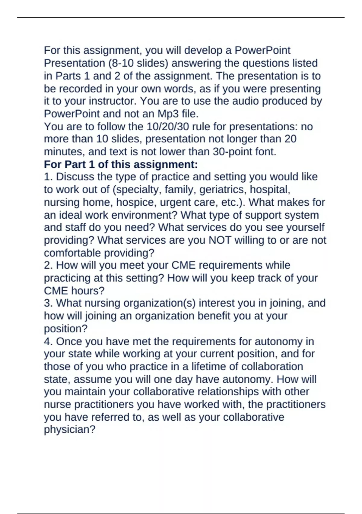 in Parts 1 and 2 of the assignment. The presentation is to