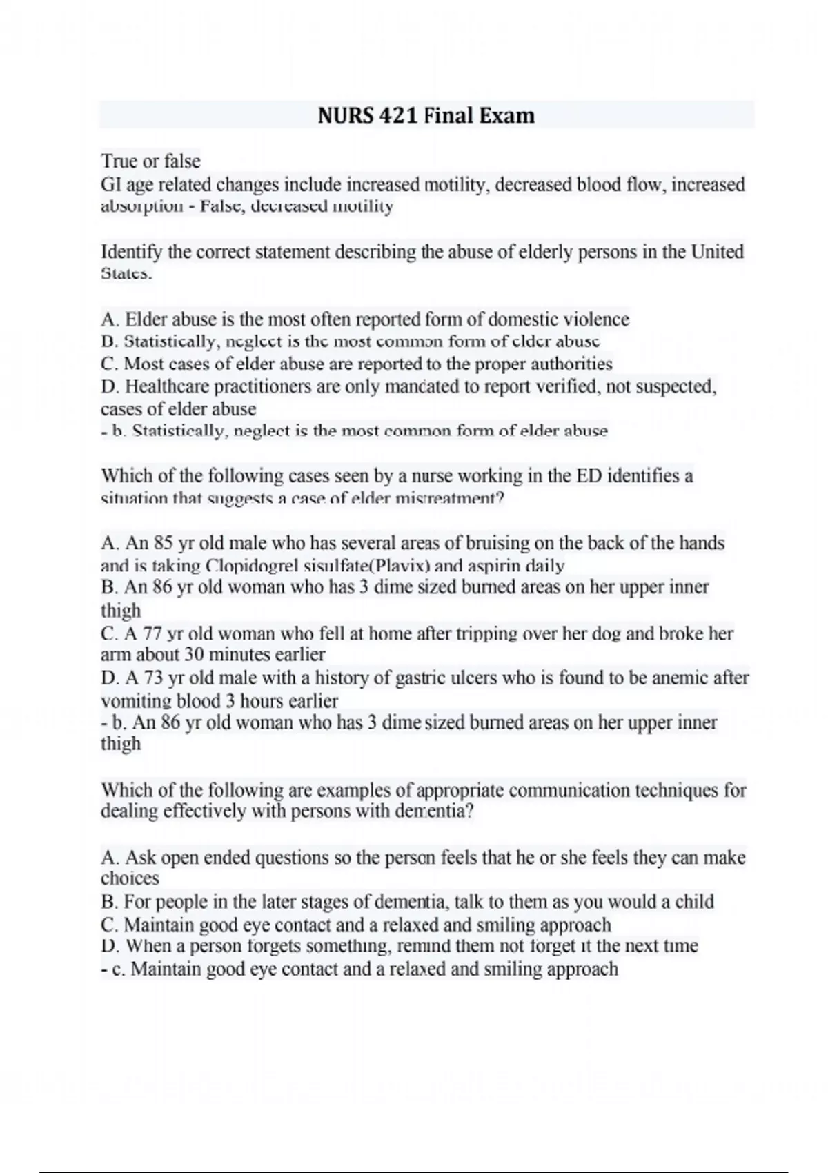 True or false GI age related changes include increased motility, decreased blood flow, increased absorption - False, decreased motility Identify the correct statement describing the abuse of elderly persons in the United States. A. Elder abuse is the most often reported form of domestic violence B. Statistically, neglect is the most common form of elder abuse C. Most cases of elder abuse are reported to the proper authorities D. Healthcare practitioners are only mandated to report verified, not suspected, cases of elder abuse - b. Statistically, neglect is the most common form of elder abuse Which of the following cases seen by a nurse working in the ED identifies a situation that suggests a case of elder mistreatment? A. An 85 yr old male who has several areas of bruising on the back of the hands and is taking Clopidogrel sisulfate(Plavix) and aspirin daily B. An 86 yr old woman who has 3 dime sized burned areas on her upper inner thigh C. A 77 yr old woman who fell at home after tripping over her dog and broke her arm about 30 minutes earlier D. A 73 yr old male with a history of gastric ulcers who is found to be anemic after vomiting blood 3 hours earlier - b. An 86 yr old woman who has 3 dime sized burned areas on her upper inner thigh Which of the following are examples of appropriate communication techniques for dealing effectively with persons with dementia? A. Ask open ended questions so the person feels that he or she feels they can make choices B. For people in the later stages of dementia, talk to them as you would a child C. Maintain good eye contact and a relaxed and smiling approach D. When a person forgets something, remind them not forget it the next time - c. Maintain good eye contact and a relaxed and smiling approach Mr Reynolds experienced a transient ischemic attack (TIA) 3 weeks ago that had significant effects on his motor and sensory function. Which of the following assessment findings should signal to the nurse to the possibility that Mr Reynolds is experiencing dysphagia? A. Mr. Reynolds complains of being excessively hungry in the mid afternoon and evening B. When providing oral care, the nurse finds food pocketed in Mr Reynolds cheek C. Mr Reynolds drinks large amounts of water, before, during and after meals D. Mr Reynolds prefers to sit in a high fowlers position after meals - b. When providing oral care, the nurse finds food pocketed in Mr Reynolds cheek Statistically, which of the following clients is at greatest risk for mistreatment in the domestic setting? A. An active 70 yr old woman with well controlled diabetes who live alone B. A healthy 75 yr old man who is a retied businessman and lives with his son C. An 82 yr old woman with severe osteoarthritis and macular degeneration who lives with her single daughter who has an adult son with cerebral palsy D. A 77 yr old man who has a history of coronary bypass surgery and lives with his wife - c. An 82 yr old woman with severe osteoarthritis and macular degeneration who lives with her single daughter who has an adult son with cerebral palsy When a patient is admitted to a hospital, he or she is asked if an advance directive is available in case terminal care is necessary. What does an advance directive do? A. It gives the patient's family control over terminal care regardless of the patient's wishes B. It gives the patient control over terminal care by appointing an decision maker in the event they cannot make their own decisions C. It gives the hospital control over terminal care D. It gives the attending physician control over terminal care - b. It gives the patient control over terminal care by appointing an decision maker in the event they cannot make their own decisions A 78 yr old woman was diagnosed with colorectal cancer 18 mos ago and underwent chemotherapy. A recent CT scan has shown has metastasized to her lungs and liver. The woman states that she feels well and does not want to undergo any further debilitating chemotherapy. The son and daughter are adamantly opposed to their mother's forgoing treatment and have appealed to the nurse. What factor is the primary consideration in this scenario? A. The family's wishes B. The woman's prognosis C. The woman's autonomy D. The woman's treatment options - c. The woman's autonomy Which of the following are social risk factors for impaired nutrition? Select all that apply. A. Isolation B. Loneliness C. Depression D. Poverty - a, b, and d A mini nutritional score between 8 and 11 indicates dehydration. True or false - False Lab values associate with poor nutrition include... Select all that apply. A. Serum albumin B. Increased magnesium C. Serum prealbumin D. Cholesterol - a, c, and d What contributes to neuron death & may progress to Alzheimers? - B-amyloid What should you do before treating a patient with delirium? - Identify the underlying cause TRUE OR FALSE: During hospice care one physician must determine the patient has 6 months to live - FALSE; two physicians Hospice care is not appropriate in which of these circumstances? A. The patient decides to forego curative treatment. B. The patient's prognosis is 3 to 6 months. C. The patient is undergoing experimental chemotherapy. D. The patient is receiving palliative chemotherapy. - c. The patient is undergoing experimental chemotherapy. Rationale: Hospice care is not appropriate for patients undergoing active curative therapy. All other statements are correct regarding hospice care. Mrs. Jones is receiving hospice care in the nursing home. During the assessment, the nurse observes the patient is unconscious and has wet, noisy respirations and cool, mottled extremities. The nurse understands which of the following actions are indicated? (Select all that apply.) A. Notifying the patient's family B. Requesting an order for an anticholinergic medication C. Notifying the patient's provider D. Performing a sternal rub to assess the patient's response E. Performing a full systems assessment - A, B, and C Rat