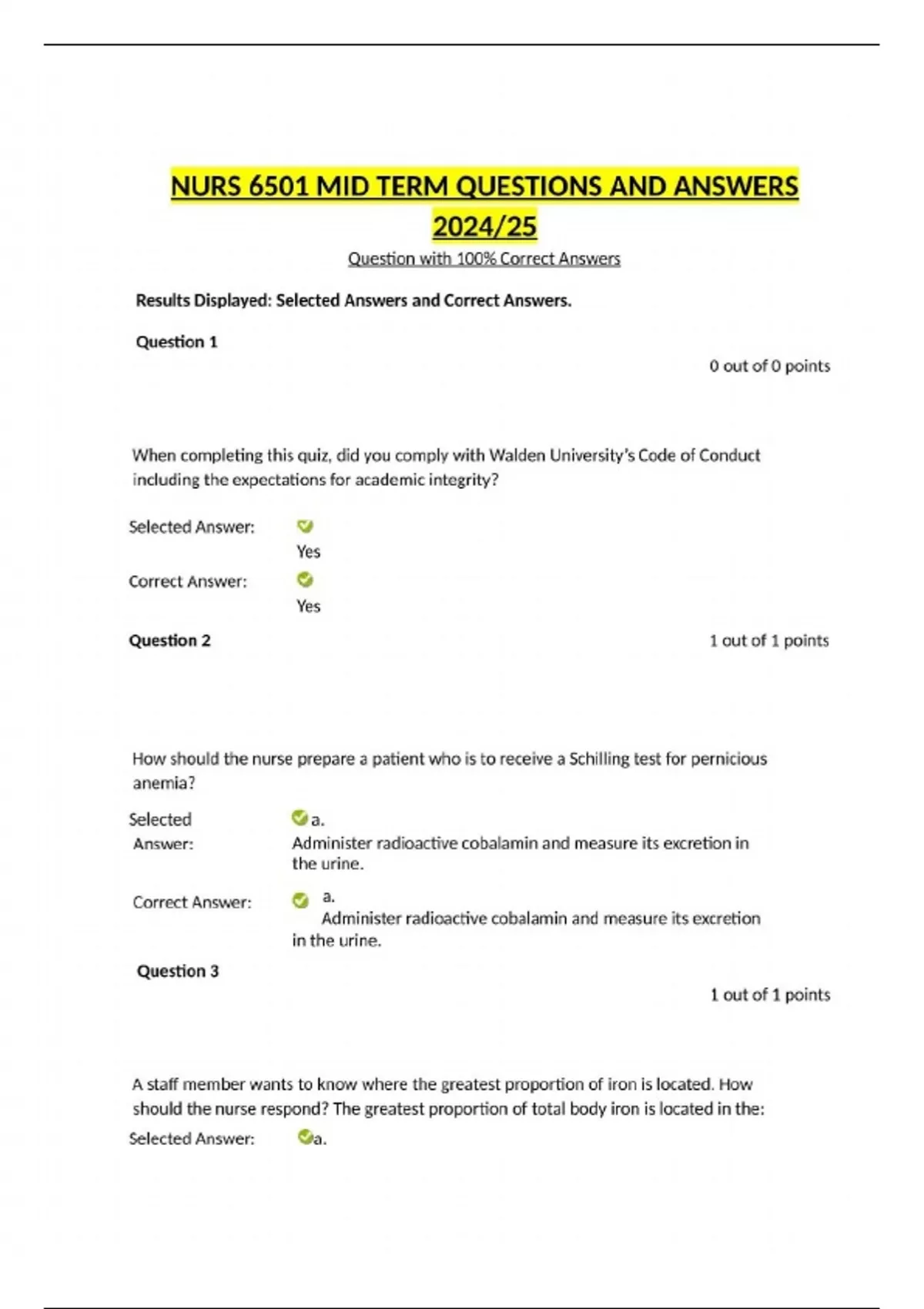 NURS 6501 MID TERM QUESTIONS AND ANSWERS 2024/25 Question with 100% Correct Answers Results Displayed: Selected Answers and Correct Answers. Question 1 0 out of 0 points When completing this quiz, did you comply with Walden University’s Code of Conduct including the expectations for academic integrity? Selected Answer: Yes Correct Answer: Yes Question 2 1 out of 1 points How should the nurse prepare a patient who is to receive a Schilling test for pernicious anemia? Selected a. Answer: Correct Answer: Question 3 Administer radioactive cobalamin and measure its excretion in the urine. a. Administer radioactive cobalamin and measure its excretion in the urine. 1 out of 1 points A staff member wants to know where the greatest proportion of iron is located. How should the nurse respond? The greatest proportion of total body iron is located in the: Selected Answer: a. Erythrocytes