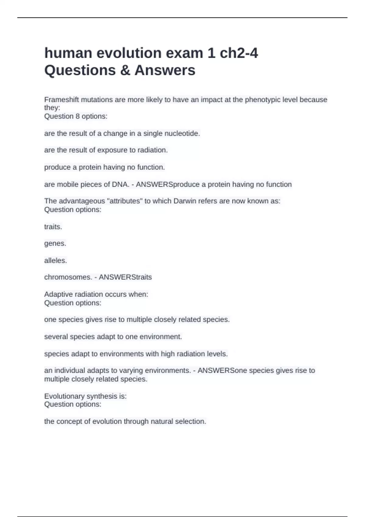 Frameshift mutations are more likely to have an impact at the phenotypic level because they: Question 8 options: are the result of a change in a single nucleotide. are the result of exposure to radiation. produce a protein having no function. are mobile pieces of DNA. - ANSWERSproduce a protein having no function The advantageous "attributes" to which Darwin refers are now known as: Question options: traits. genes. alleles. chromosomes. - ANSWERStraits Adaptive radiation occurs when: Question options: one species gives rise to multiple closely related species. several species adapt to one environment. species adapt to environments with high radiation levels. an individual adapts to varying environments. - ANSWERSone species gives rise to multiple closely related species. Evolutionary synthesis is: Question options: the concept of evolution through natural selection. a unified theory of evolution that combines genetics with natural selection. a combination of the inheritance of acquired characteristics and natural selection. the combination of the theory of evolution and Linnaean taxonomy. - ANSWERSa unified theory of evolution that combines genetics with natural selection. Thomas Malthus's contribution to natural selection is the: a. binomial taxonomic system of naming species. b. theory that the earth's old age is based on geologic evidence resulting from cataclysmic events. c. observation that an abundance of food would allow a population to increase geometrically and indefinitely, but there simply is not enough food, so populations are limited by food supply. d. theory that environmental resources increase to population pressures. - ANSWERSc. observation that an abundance of food would allow a population to increase geometrically and indefinitely, but there simply is not enough food, so populations are limited by food supply. Darwinian evolution proposes that: a. species adapt and change over time based on the environment. b. an individual can change within its own lifetime. c. species adapt based on individual goals. d. individuals determine their own biological adaptations. - ANSWERSa. species adapt and change over time based on the environment. James Hutton is associated primarily with: a. adaptation. b. catastrophism. c. uniformitarianism. d. principles of heredity. - ANSWERSc. uniformitarianism. According to Darwin, natural selection operates at the level of: a. individuals. b. genes. c. populations. d. species. - ANSWERSa. individuals. How was Darwin influenced by Thomas Malthus's work on population growth? a. Darwin was interested in Malthus's examination of population changes in pea plants. b. Darwin was influenced by Malthus's work on demography and population responses to food availability. c. Darwin liked the concept of Latin taxonomic classification as it pertained to human groups. d. Darwin was greatly influenced by research on acquired characteristics. - ANSWERSb. Darwin was influenced by Malthus's work on demography and population responses to food availability. The forces of evolution include: a. gene flow, mutations, chromosomes, and genes. b. mutations, genes, and genetic drift. c. natural selection, variation (mutation) gene flow, and genetic drift. d. natural selection, genes, alleles, and chromosomes. - ANSWERSc. natural selection, variation (mutation) gene flow, and genetic drift. How did Lamarck contribute to the theory of evolution? a. He discovered genetic mutation through experiments with pea plants. b. He proposed the concept of natural selection after his voyage to the Galapagos Islands and his study of finches. c. He proposed the first serious model of how traits are passed on from parent to offspring through inheritance of acquired characteristics, though that idea turned out to be incorrect. d. He proposed a concept known today as gene flow. - ANSWERSc. He proposed the first serious model of how traits are passed on from parent to offspring through inheritance of acquired characteristics, though that idea turned out to be incorrect. The scientist who coined the name Homo sapiens for human beings and placed them in a higher taxonomic group (primates) was: a. Charles Darwin. b. Georges Cuvier. c. Carolus Linnaeus. d. Robert Hooke. - ANSWERSc. Carolus Linnaeus. In your textbook, the lower frequency of sickle-cell anemia among present-day Americans of West African ancestry as compared to people living in West Africa blacks is attributed to: a. genetic drift. b. gene flow. c. new mutations. d. none of the above - ANSWERSb. gene flow. Why are Darwin's finches considered good examples of natural selection? a. They are found on every continent. b. They originated in North America, according to fossil evidence. c. They embody the idea of descent with modification. d. They did not differ between populations. - ANSWERSc. They embody the idea of descent with modification. Linnaeus's taxonomic system is referred to as a "hierarchy" because: a. each species has a "higher level" genus and "lower level" species, and are placed within additional higher level categories. b. species are placed in a ranked list called the "Great Chain of Being." c. humans are considered the most evolved species. d. naming species officially requires approval of an appointed board of high-level experts. - ANSWERSa. each species has a "higher level" genus and "lower level" species, and are placed within additional higher level categories. Gene flow differs from genetic drift because gene flow is: a. a random change in the frequency of alleles due to isolation or migration of smaller populations. b. random change in a gene or chromosome. c. the guiding force of evolution. d. the spread of new genetic material from one gene pool to another. - ANSWERSd. the spread of new genetic material from one gene pool to another. Question 1 Unsaved The scientist whose work provided the foundation for later understandings of genetics was: Question 1 options: John Ray. Gregor Mendel. Charles Darwin. Robert Ho