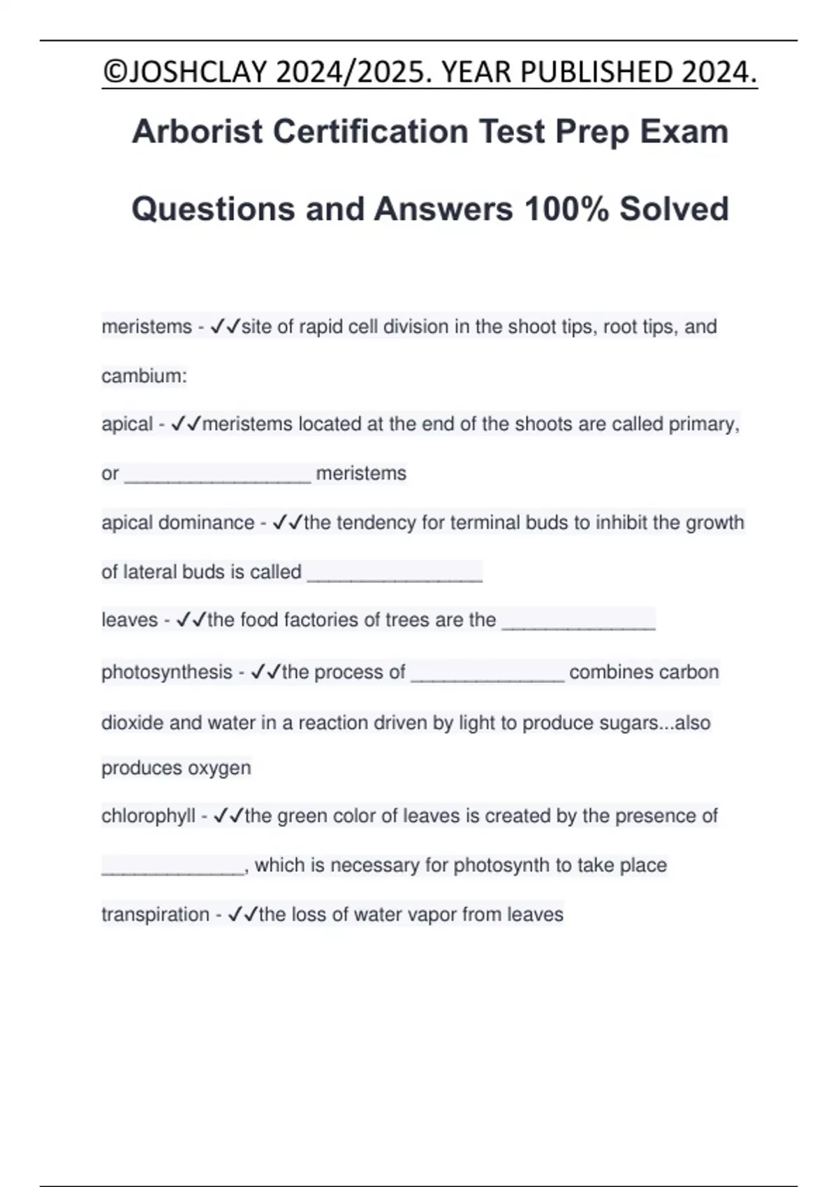 Arborist Certification Test Prep Exam Questions and Answers 100% Solved meristems - site of rapid cell division in the shoot tips, root tips, and cambium: apical - meristems located at the end of the shoots are called primary, or _________________ meristems apical dominance - the tendency for terminal buds to inhibit the growth of lateral buds is called ________________ leaves - the food factories of trees are the ______________ photosynthesis - the process of ______________ combines carbon dioxide and water in a reaction driven by light to produce sugars...also produces oxygen chlorophyll - the green color of leaves is created by the presence of _____________, which is necessary for photosynth to take place transpiration - the loss of water vapor from leaves