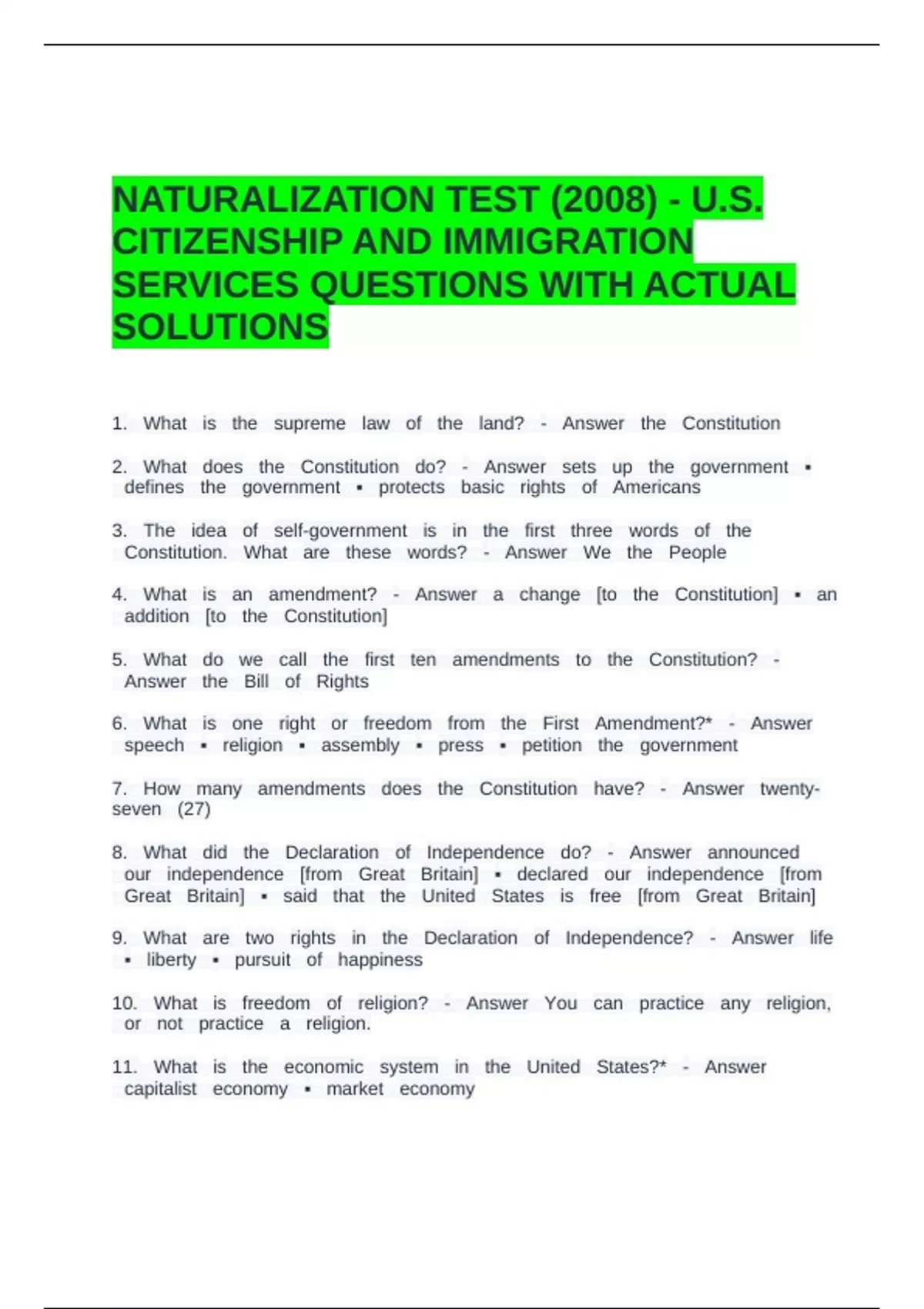 NATURALIZATION TEST (2008) - U.S. CITIZENSHIP AND IMMIGRATION SERVICES QUESTIONS WITH ACTUAL SOLUTIONS.