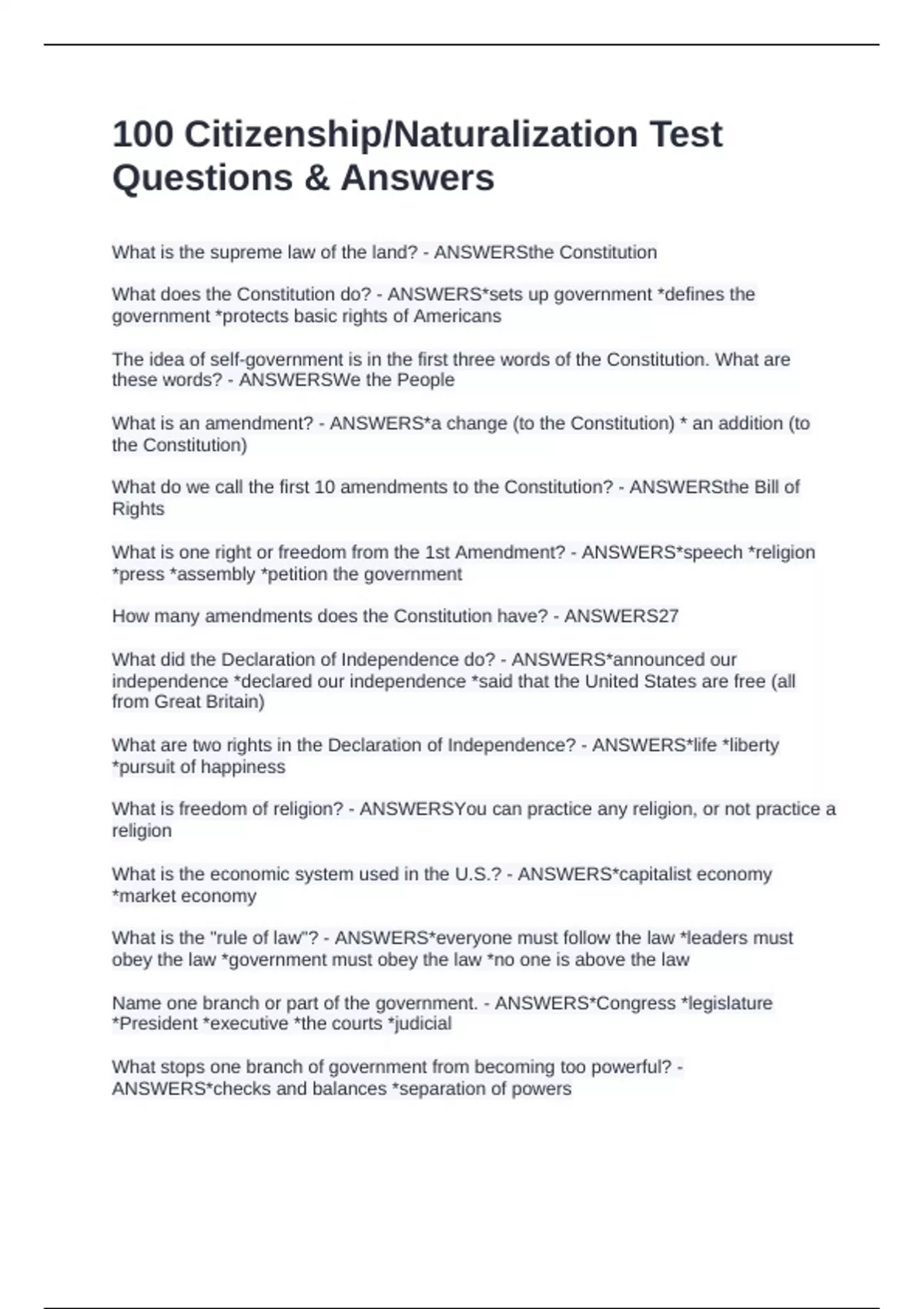 What is the supreme law of the land? - ANSWERSthe Constitution What does the Constitution do? - ANSWERS*sets up government *defines the government *protects basic rights of Americans The idea of self-government is in the first three words of the Constitution. What are these words? - ANSWERSWe the People What is an amendment? - ANSWERS*a change (to the Constitution) * an addition (to the Constitution) What do we call the first 10 amendments to the Constitution? - ANSWERSthe Bill of Rights What is one right or freedom from the 1st Amendment? - ANSWERS*speech *religion *press *assembly *petition the government How many amendments does the Constitution have? - ANSWERS27 What did the Declaration of Independence do? - ANSWERS*announced our independence *declared our independence *said that the United States are free (all from Great Britain) What are two rights in the Declaration of Independence? - ANSWERS*life *liberty *pursuit of happiness What is freedom of religion? - ANSWERSYou can practice any religion, or not practice a religion What is the economic system used in the U.S.? - ANSWERS*capitalist economy *market economy What is the "rule of law"? - ANSWERS*everyone must follow the law *leaders must obey the law *government must obey the law *no one is above the law Name one branch or part of the government. - ANSWERS*Congress *legislature *President *executive *the courts *judicial What stops one branch of government from becoming too powerful? - ANSWERS*checks and balances *separation of powers Who is in charge of the executive branch? - ANSWERSthe President Who makes federal laws? - ANSWERS*Congress *Senate & House of Representatives *U.S. or national legislature What are the two parts of the U.S. Congress? - ANSWERS*the Senate and the House of Representatives How many U.S. Senators are there? - ANSWERS100 We elect a U.S. Senator for how many years? - ANSWERS6 Who is one of your state's U.S. Senators now? - ANSWERS*Mike Lee *Mitt Romney The House of Representatives has how many voting members? - ANSWERS435 We elect a U.S. Representative for how many years? - ANSWERS2 Name your U.S. Representative. - ANSWERSRob Bishop Who does a U.S. Senator represent? - ANSWERSall the people of the state Why do some states have more Representatives than other states? - ANSWERS*because of the state's population *because they have more people *because some states have more people We elect a President for how many years? - ANSWERS4 In what month do we vote for President? - ANSWERSNovember What is the name of the President of the United States now? - ANSWERS*Donald Trump, *Trump What is the name of the Vice President of the United States now? - ANSWERS*Mike Pence, *Pence If the President can no longer serve, who becomes President? - ANSWERSthe Vice President If both the President and the Vice President can no longer serve, who becomes President? - ANSWERSthe Speaker of the House Who is the Commander in Chief of the military? - ANSWERSthe President Who signs bills to become laws? - ANSWERSthe President Who vetoes bills? - ANSWERSthe President What does the President's Cabinet do? - ANSWERSadvises the President What are two Cabinet-level positions? - ANSWERS*Secretary of Agriculture *Commerce *Defense *Education *Energy *Health and Human Services *Homeland Security *Housing and Urban Development *Interior *Labor *State *Transportation *Treasury *Veterans Affairs *Attorney General *Vice President What does the judicial branch do? - ANSWERS*reviews laws *explains laws *resolves disputes (disagreements) *decides if a law goes against the Constitution What is the highest court in the United States? - ANSWERS*the Supreme Court How many justices are on the Supreme Court? - ANSWERS9 Who is the Chief Justice of the United States now? - ANSWERS*John Roberts *John G. Roberts, Jr. Under our Constitution, some powers belong to the federal government. What is one power of the federal government? - ANSWERS*to print money *to declare war *to create and army *to make treaties Under our Constitution, some powers belong to the states. What is one power of the states? - ANSWERS*provide schooling and education *provide protection (police) *provide safety (fire department) *give a driver's license *approve zoning and land use Who is the Governor of your state now? - ANSWERSGary Herbert What is the capital of your state? - ANSWERSSalt Lake City What are the two major political parties in the United States? - ANSWERSDemocratic and Republican What is the political party of the President now? - ANSWERSRepublican (Party) What is the name of the Speaker of the House of Representatives now? - ANSWERSNancy Pelosi There are four amendments to the Constitution about who can vote. Describe one of them. - ANSWERS*citizens 18 and older can vote *You don't have to pay taxes to vote *Any citizen can vote (women and men) *A male citizen of any race (can vote) What is one responsibility that is only for United States citizens? - ANSWERS*serve on a jury *vote in a federal election Name one right only for United States citizens. - ANSWERS*vote in a federal election *run for federal office What are two rights of everyone living in the United States? - ANSWERS*freedom of expression *speech *assembly *petition the government *worship *right to bear arms What do we show loyalty to when we say the Pledge of Allegiance? - ANSWERS*the United States *the flag What is one promise you make when you become a United States citizen? - ANSWERS*give up loyalty to other countries *defend the Constitution and the laws of the United States *obey the laws of the United States *serve in the U.S. military (if needed) *serve (do important work for ) the nation (if needed) *be loyal to the United States How old do citizens have to be to vote for President? - ANSWERS18 What are two ways Americans can participate in their democracy? - ANSWERS*vote *join a political party *help with a campaign *join a civic group *join a community group *give an elected official your opinion
