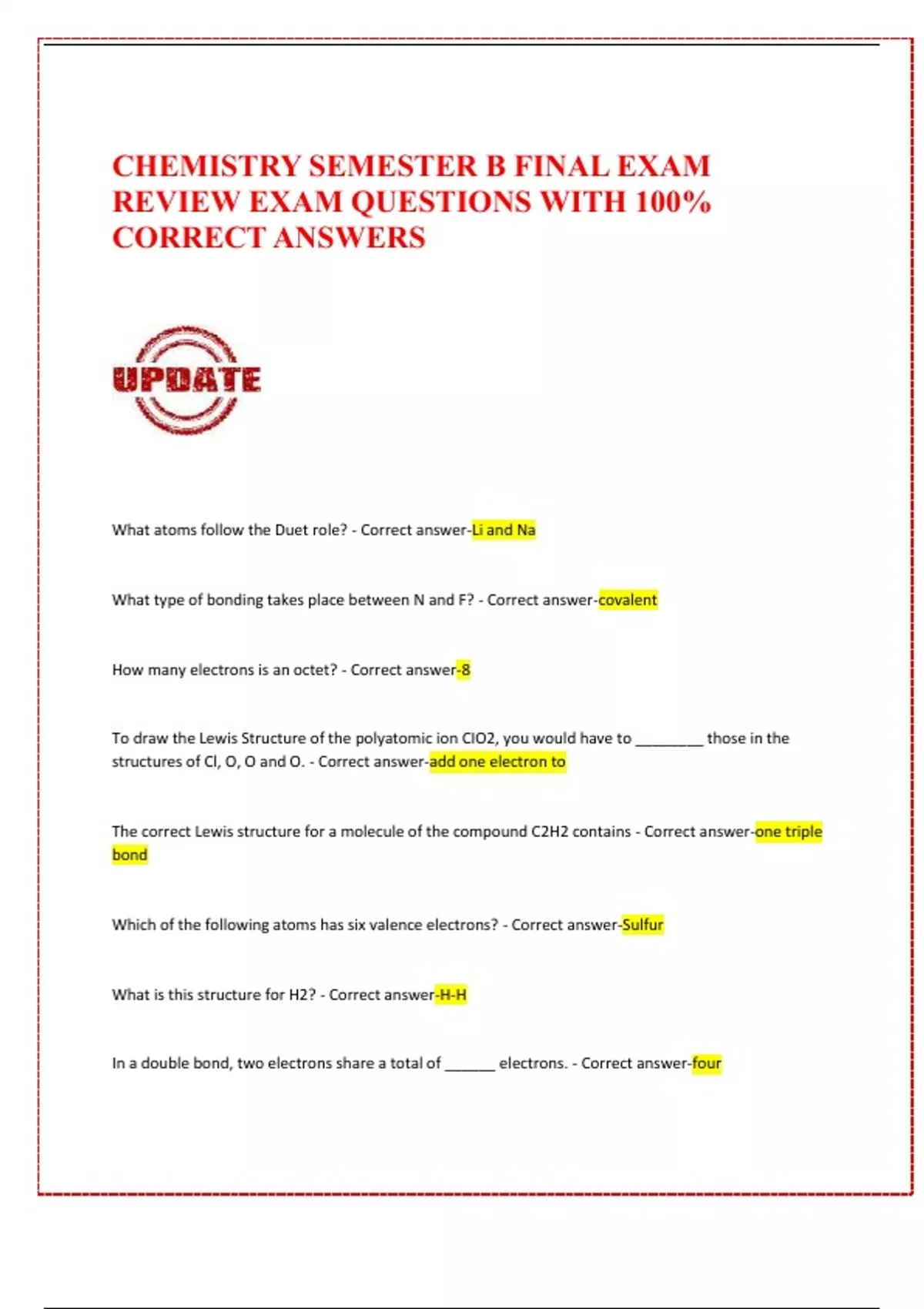 What atoms follow the Duet role? - Correct answer-Li and Na What type of bonding takes place between N and F? - Correct answer-covalent How many electrons is an octet? - Correct answer-8 To draw the Lewis Structure of the polyatomic ion CIO2, you would have to ________ those in the structures of Cl, O, O and O. - Correct answer-add one electron to The correct Lewis structure for a molecule of the compound C2H2 contains - Correct answer-one triple bond Which of the following atoms has six valence electrons? - Correct answer-Sulfur
