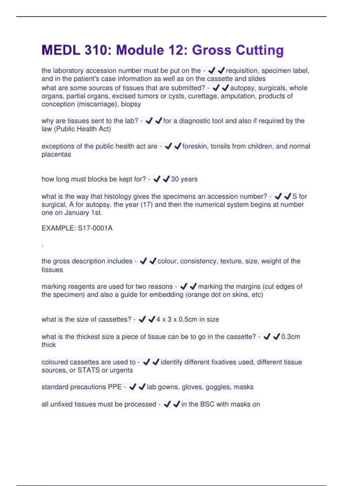 the laboratory accession number must be put on the - ️️requisition, specimen label, and in the patient's case information as well as on the cassette and slides what are some sources of tissues that are submitted? - ️️autopsy, surgicals, whole organs, partial organs, excised tumors or cysts, curettage, amputation, products of conception (miscarriage), biopsy why are tissues sent to the lab? - ️️for a diagnostic tool and also if required by the law (Public Health Act) exceptions of the public health act are - ️️foreskin, tonsils from children, and normal placentas how long must blocks be kept for? - ️️30 years what is the way that histology gives the specimens an accession number? - ️️S for surgical, A for autopsy. the year (17) and then the numerical system begins at number one on January 1st. EXAMPLE: S17-0001A . the gross description includes - ️️colour, consistency, texture, size, weight of the tissues marking reagents are used for two reasons - ️️marking the margins (cut edges of the specimen) and also a guide for embedding (orange dot on skins, etc) what is the size of cassettes? - ️️4 x 3 x 0.5cm in size what is the thickest size a piece of tissue can be to go in the cassette? - ️️0.3cm thick coloured cassettes are used to - ️️identify different fixatives used, different tissue sources, or STATS or urgents standard precautions PPE - ️️lab gowns, gloves, goggles, masks all unfixed tissues must be processed - ️️in the BSC with masks onif tissues with KNOWN cases of TB, hepatitis, AIDS or CJD - ️️extend the fixation time, how long should a specimen be kept for - ️️lethbridge is 8 weeks but some are 1-3 months excision biopsy - ️️removal of a small lesion needle (aspiration) biopsy - ️️hollow needle into internal organ, small tissue