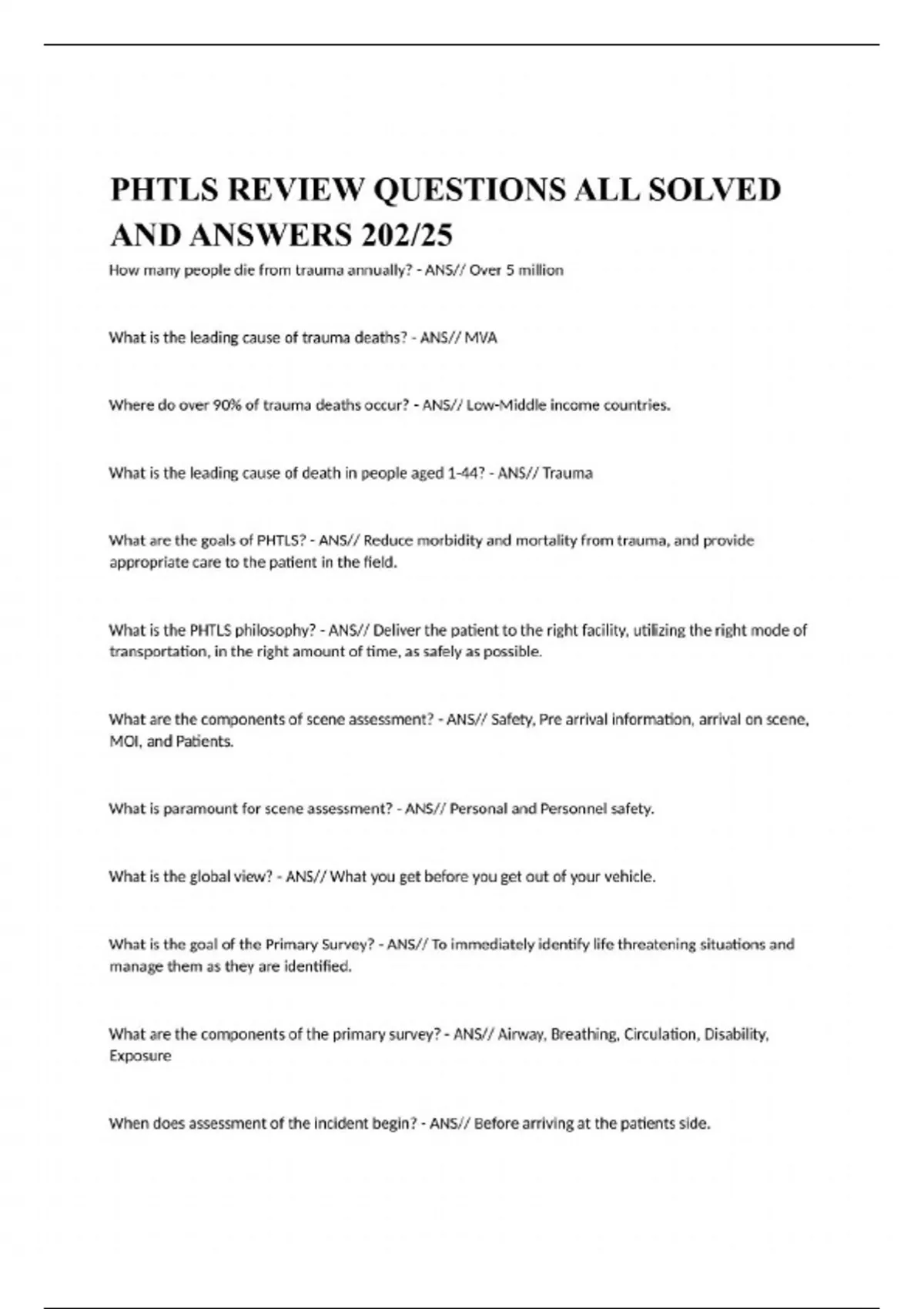 PHTLS REVIEW QUESTIONS ALL SOLVED AND ANSWERS 202/25 How many people die from trauma annually? - ANS// Over 5 million What is the leading cause of trauma deaths? - ANS// MVA Where do over 90% of trauma deaths occur? - ANS// Low-Middle income countries. What is the leading cause of death in people aged 1-44? - ANS// Trauma What are the goals of PHTLS? - ANS// Reduce morbidity and mortality from trauma, and provide appropriate care to the patient in the field. What is the PHTLS philosophy? - ANS// Deliver the patient to the right facility, utilizing the right mode of transportation, in the right amount of time, as safely as possible. What are the components of scene assessment? - ANS// Safety, Pre arrival information, arrival on scene, MOI, and Patients. What is paramount for scene assessment? - ANS// Personal and Personnel safety. What is the global view? - ANS// What you get before you get out of your vehicle.