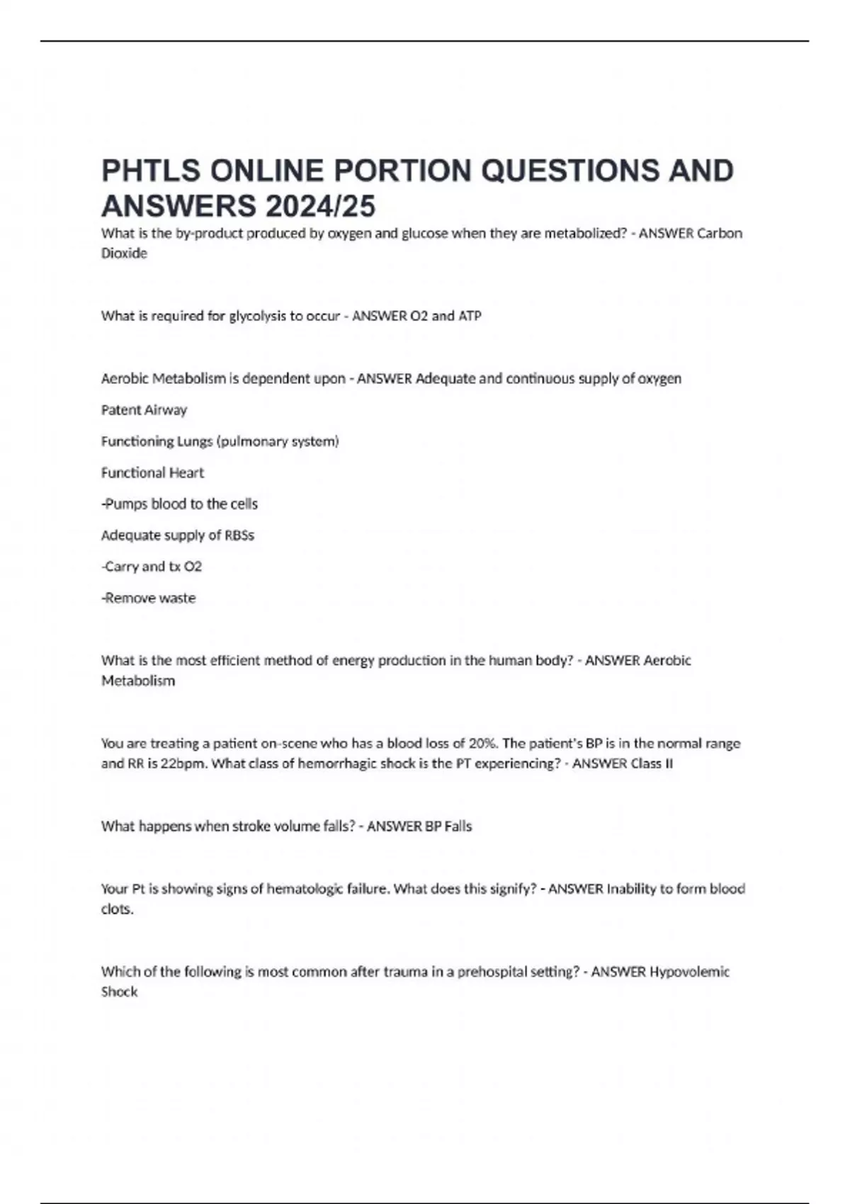 PHTLS ONLINE PORTION QUESTIONS AND ANSWERS 2024/25 What is the by-product produced by oxygen and glucose when they are metabolized? - ANSWER Carbon Dioxide What is required for glycolysis to occur - ANSWER O2 and ATP Aerobic Metabolism is dependent upon - ANSWER Adequate and continuous supply of oxygen Patent Airway Functioning Lungs (pulmonary system) Functional Heart -Pumps blood to the cells Adequate supply of RBSs -Carry and tx O2 -Remove waste What is the most efficient method of energy production in the human body? - ANSWER Aerobic Metabolism You are treating a patient on-scene who has a blood loss of 20%. The patient's BP is in the normal range and RR is 22bpm. What class of hemorrhagic shock is the PT experiencing? - ANSWER Class II What happens when stroke volume falls? - ANSWER BP Falls Your Pt is showing signs of hematologic failure. What does this signify? - ANSWER Inability to form blood clots. Which of the following is most common after trauma in a prehospital setting? - ANSWER Hypovolemic Shock In the trauma pt, what is the most common cause leading to anaerobic metabolism? - ANSWER Blood Loss Which of the following is true about distributive shock? - ANSWER It occurs when the vascular space is larger than normal. At which phase of shock do the post capillary sphincters relax? - ANSWER Washout Which type of shock presents with warm, dry skin temperature, pink skin color, and lucid loc? - ANSWER Neurogenic You are attending to a pt in the field who is in shock. Within what time Fram might kidney organ death occur? - ANSWER Within hours What occurs when one organ or structure changes speed faster than another organ or structure, snd deceleration causes the parts to separate and tear? - ANSWER Shearing Which part of the primary assessment evaluates loc? - ANSWER Disability What does Newtons second law of motion state? - ANSWER Energy can neither be created or destroyed, but can be changed in form. What helps determine which patients need attention first and if there are enough resources available? - ANSWER Triage What's one of the first things you should do when encountering a patient with significant injuries in a prehospital setting? - ANSWER Deliver supplemental high-flow O2