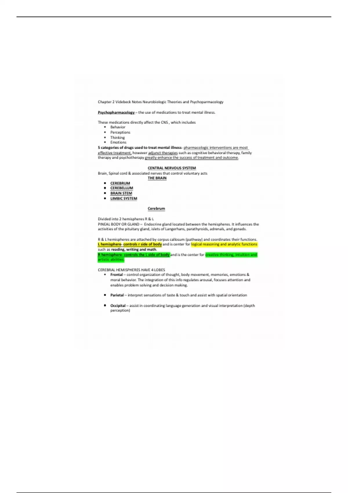 Chapter 2 Videbeck Notes Neurobiologic Theories and Psychoparmacology