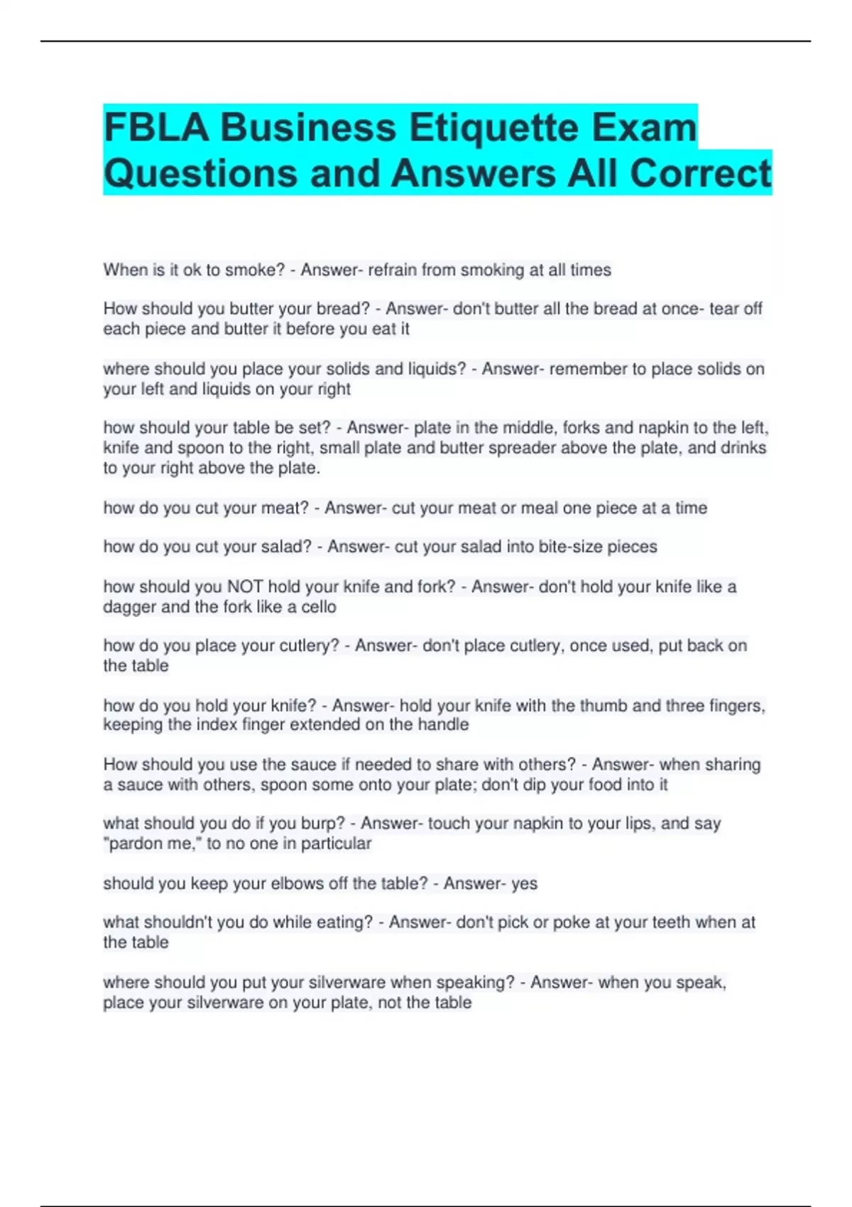 FBLA Business Etiquette Exam Questions and Answers All Correct When is it ok to smoke? - Answer- refrain from smoking at all times How should you butter your bread? - Answer- don't butter all the bread at once- tear off each piece and butter it before you eat it where should you place your solids and liquids? - Answer- remember to place solids on your left and liquids on your right how should your table be set? - Answer- plate in the middle, forks and napkin to the left, knife and spoon to the right, small plate and butter spreader above the plate, and drinks to your right above the plate. how do you cut your meat? - Answer- cut your meat or meal one piece at a time how do you cut your salad? - Answer- cut your salad into bite-size pieces how should you NOT hold your knife and fork? - Answer- don't hold your knife like a dagger and the fork like a cello how do you place your cutlery? - Answer- don't place cutlery, once used, put back on the table how do you hold your knife? - Answer- hold your knife with the thumb and three fingers, keeping the index finger extended on the handle How should you use the sauce if needed to share with others? - Answer- when sharing a sauce with others, spoon some onto your plate; don't dip your food into it what should you do if you burp? - Answer- touch your napkin to your lips, and say "pardon me," to no one in particular should you keep your elbows off the table? - Answer- yes what shouldn't you do while eating? - Answer- don't pick or poke at your teeth when at the table where should you put your silverware when speaking? - Answer- when you speak, place your silverware on your plate, not the table what is something you should not do when speaking? - Answer- don't speak with your mouth full
