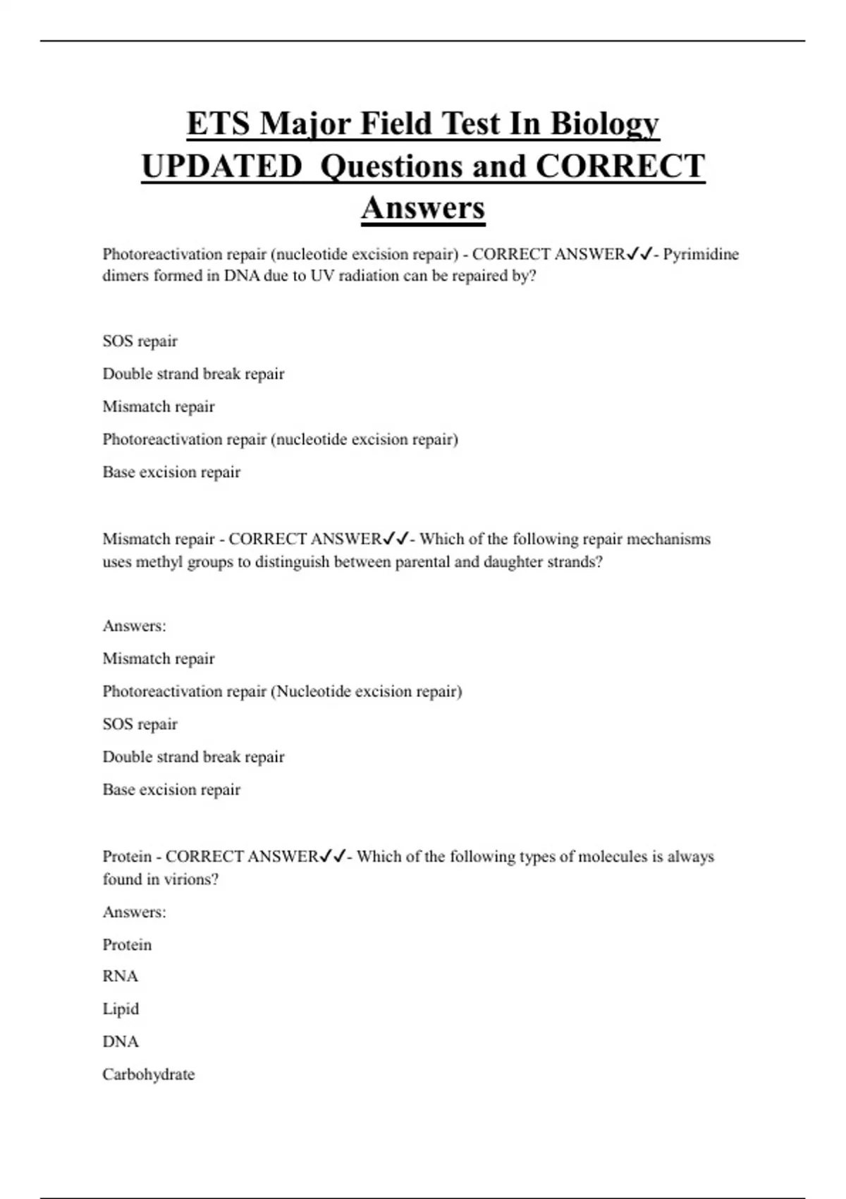ETS Major Field Test In Biology UPDATED Questions and CORRECT Answers Photoreactivation repair (nucleotide excision repair) - CORRECT ANSWER- Pyrimidine dimers formed in DNA due to UV radiation can be repaired by? SOS repair Double strand break repair Mismatch repair Photoreactivation repair (nucleotide excision repair) Base excision repair