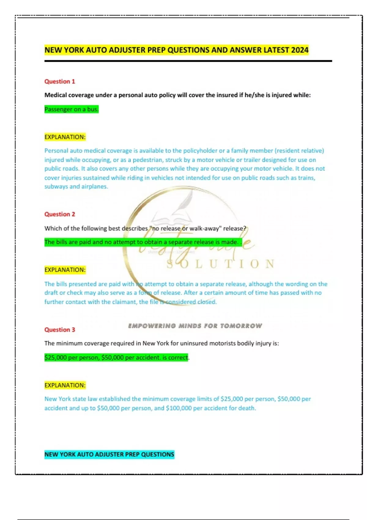 NEW YORK AUTO ADJUSTER PREP QUESTIONS