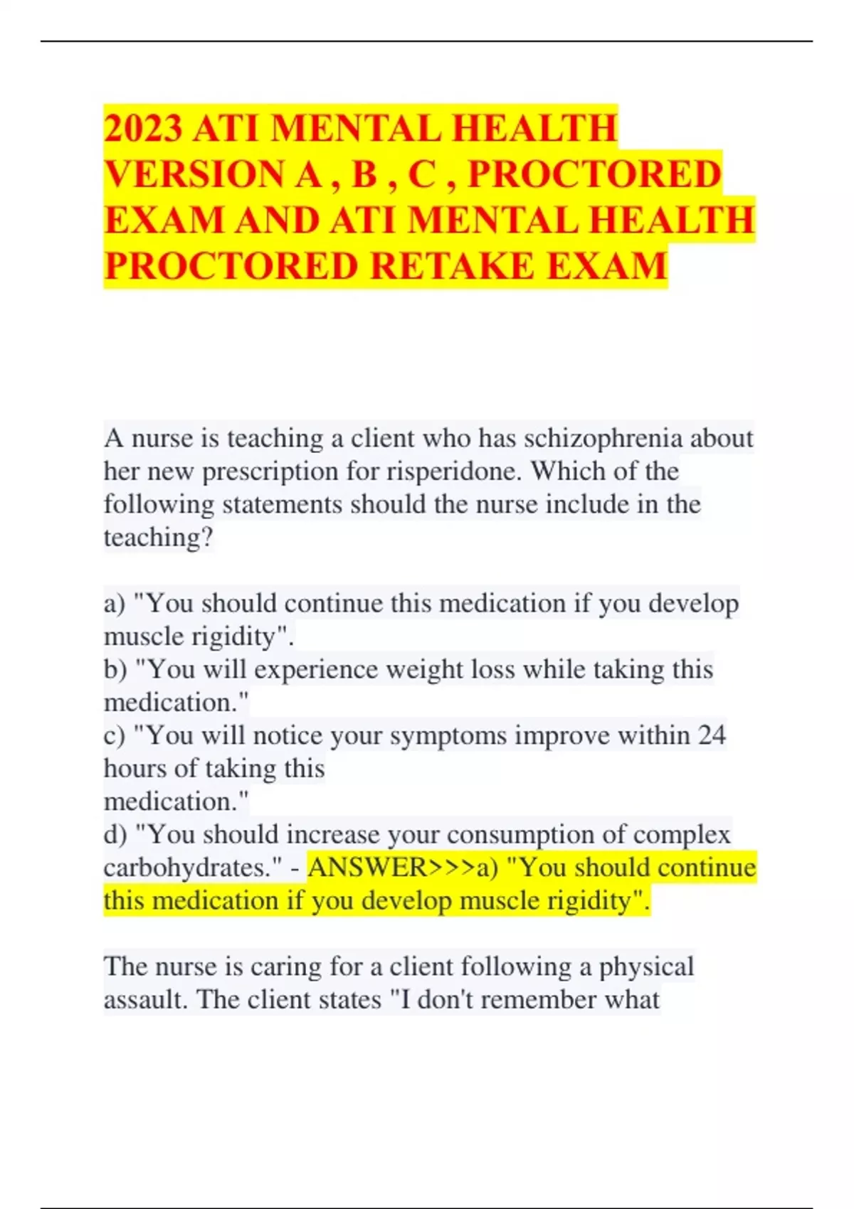 2023 ATI MENTAL HEALTH VERSION A , B , C , PROCTORED EXAM AND ATI MENTAL HEALTH PROCTORED RETAKE EXAM A nurse is teaching a client who has schizophrenia about her new prescription for risperidone. Which of the following statements should the nurse include in the teaching? a) "You should continue this medication if you develop muscle rigidity". b) "You will experience weight loss while taking this medication." c) "You will notice your symptoms improve within 24 hours of taking this medication." d) "You should increase your consumption of complex carbohydrates." - ANSWER>>>a) "You should continue this medication if you develop muscle rigidity". The nurse is caring for a client following a physical assault. The client states "I don't remember what happened to me." The nurse should recognize that the client is using which of the following defense mechanisms? a) Repression b) Displacement c) Rationalization d) Denial - ANSWER>>>a) Repression A nurse is caring for a client who has anorexia nervosa. Which of the following findings require immediate intervention by the nurse? a) +2 edema of the lower extremities b) BUN 21 mg dL c) Lanugo covering the body d) Blood pH 7.60 - ANSWER>>>d) Blood pH 7.60 A nurse is caring for a client in a mental health facility. The client is agitated and threatens to harm herself and others. Which of the following is the priority intervention? a) Place the client in restraints b) Administer an anti-anxiety medication to the client c) Put the client in seclusion d) Set limits on the client's behavior - ANSWER>>>d) Set limits on the client's behavior A nurse is caring for a client who was involuntarily committed and is scheduled to receive electroconvulsive therapy (ECT). The client refuses the treatment and will not discuss why with the health care team. Which of the following actions should the nurse take? a) Ask the clients family to encourage the client to receive ECT b) Inform the client that ECT does not require a consent. c) Document the client's refusal of the treatment in the medical record. d) Tell the client he cannot refuse the treatment because he was involuntarily committed. - ANSWER>>>c) Document the client's refusal of the treatment in the medical record. A nurse in the emergency department is caring for a client who reports feeling sad, worthless, and hopeless 9 months after the death of her son. Which of the following actions should the nurse take first? a) Request a mental health consult for the client. b) Ask the client if she has thought about harming herself. c) Encourage the client to attend a grief support group. d) Discuss the clients' coping skills. - ANSWER>>>d) Discuss the clients' coping skills. A nurse is caring for a client who has borderline personality disorder and has been engaging in selfmutilation. The nurse should encourage the client to participate in which of the following groups. a) Dual diagnosis treatment group b) Dialectical treatment group c) Desensitization therapy d) Co-dependents support group. - ANSWER>>>b) Dialectical treatment group The nurse is reviewing the medication administration record of a client who has schizophrenia. The nurse should plan to initiate the Abnormal Involuntary Movement Scale to monitor for adverse effects of which of the following medications.? a) Amantadine b) Diphenhydramine c) Benztropine d) Haloperidol - ANSWER>>>d) Haloperidol A nurse is counseling a client following the death of a clients partner 8 months ago. Which of the following client statements indicates maladaptive grieving? a) I am so sorry for the times I was angry with my partner. b) I find myself thinking about my partner often. c) I still don't feel up to returning to work. d) I like looking at his personal items in the closet. - ANSWER>>>c) I still don't feel up to returning to work. A nurse is caring for a client who has borderline personality disorder. Which of the following outcomes should the nurse include in the treatment plan? a) The client will report a decrease in hallucinations. b) The client will communicate needs c) The client will verbalize improved mood d) The client will attend to personal hygiene. - ANSWER>>>c) The client will verbalize improved mood A nurse is caring for a client who is prescribed massage therapy to treat panic disorder. The client states "I can't stand to be touched by another person." Which of the following responses should the nurse make? a) Why don't you like to be touched by others? b) Don't worry about it. Your anxiety will lessen once the massage begins. c) I will tell your provider you would like a treatment other than a massage. d) I will request that the massage therapist wear gloves during your treatment. - ANSWER>>>c) I will tell your provider you would like a treatment other than a massage