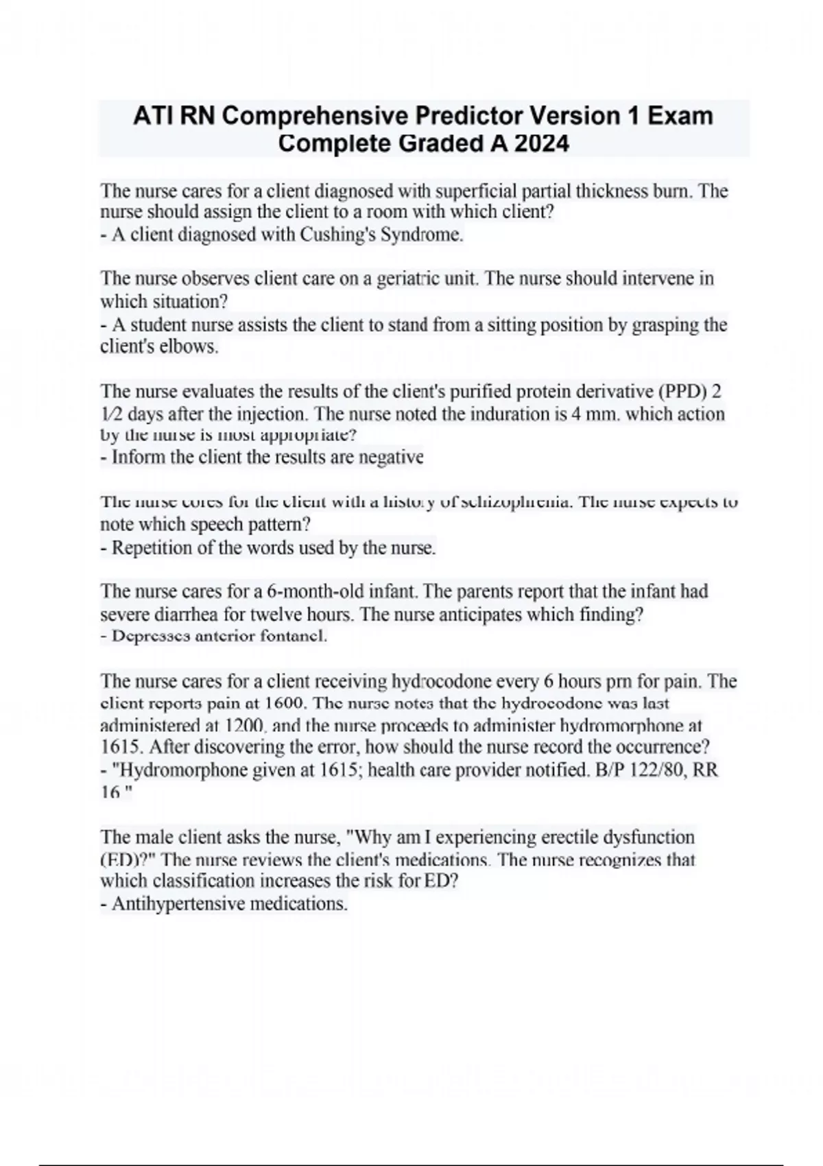 The nurse cares for a client diagnosed with superficial partial thickness burn. The nurse should assign the client to a room with which client? - A client diagnosed with Cushing's Syndrome. The nurse observes client care on a geriatric unit. The nurse should intervene in which situation? - A student nurse assists the client to stand from a sitting position by grasping the client's elbows. The nurse evaluates the results of the client's purified protein derivative (PPD) 2 1⁄2 days after the injection. The nurse noted the induration is 4 mm. which action by the nurse is most appropriate? - Inform the client the results are negative The nurse cores for the client with a history of schizophrenia. The nurse expects to note which speech pattern? - Repetition of the words used by the nurse. The nurse cares for a 6-month-old infant. The parents report that the infant had severe diarrhea for twelve hours. The nurse anticipates which finding? - Depresses anterior fontanel. The nurse cares for a client receiving hydrocodone every 6 hours prn for pain. The client reports pain at 1600. The nurse notes that the hydrocodone was last administered at 1200, and the nurse proceeds to administer hydromorphone at 1615. After discovering the error, how should the nurse record the occurrence? - "Hydromorphone given at 1615; health care provider notified. B/P 122/80, RR 16." The male client asks the nurse, "Why am I experiencing erectile dysfunction (ED)?" The nurse reviews the client's medications. The nurse recognizes that which classification increases the risk for ED? - Antihypertensive medications. ATI RN Comprehensive Predictor Version 1 Exam Complete Graded A 2024 The nurse in the hospital cafeteria overhears two nursing assistive personnel (NAP) discuss the client's condition. What is the PRIORITY action for the nurse to take? - Inform the employees about patient confidentiality and the client's right to privacy. The nurse cares for a client diagnosed with dehydration. The plan of care indicates the client is to drink two ounces of fluid every hour. The nurse determines the goal is met if which is recorded on the intake and output (I&O) sheet for an eight- hour shift? - 480 ml The nurse and LPN/LVN care for clients on a medical-surgical unit. The RN should delegate which activity to the LPN/LVN? - Take the blood pressure and heart rate before administration of enalapril. The nurses care for the client diagnosed with tuberculosis. Before discontinuing airborne precautions, the nurse must confirm which? - No acid-fast bacteria are in the sputum. The nurse cares for the client at 28 weeks gestation diagnosed with a complete placenta previa. The nurse determines discharge teaching is effective if the client makes which statement to her husband? - I'm sorry to tell you we can't have sexual relations The nurse prepares the client diagnosed with myxedema for discharge. Which action should the nurse teach related to body temperature? - "Put on multiple layers of clothes until you fell comfortably warm." The nurse cares for clients in the labor and delivery unit. The nurse anticipates which client is a candidate for induction of labor? - The client diagnosed with preeclampsia. The nurse cares for the client diagnosed with HIV. The nurse determines which goal is MOST important? - Prevent infections. The nurse educator presents an in-service on acyanotic heart disease. Which is the most common symptom of this disorder that the nurse educator should include? - Presence of an audible heart murmur. The nurse provides care for the client diagnosed with pneumonia who has postural drainage twice a day. Which client response indicates to the nurse that treatment is effective? - "I am coughing up more sputum." The risk management department plans a program to reduce errors. Which is the most common cause of errors in medication administration? - Failure to follow routine policy and procedures. The nurse cares for the school-aged child newly diagnosed with type 1 diabetes. The nurse instructs the family that the child's insulin needs will decrease during which situation? - Active exercise The nurse cares for the client receiving lactulose. The nurse determines the medication is effective if which is observed? - The client is alert and oriented to person, place and time. The nurse cares for the three-year-old prior to a surgical procedure. Which behavior indicates that the child is coping with preoperative preparation? - The child talks about the picture of a nurse and client while coloring the picture using a number of bright colored crayons. The nurse instructs the client after a total hip arthroplasty. The client will utilize which assistive devices in the home? – A long-handled shoehorn. A reaching device. A raised toilet seat. A shower bench. The client reports vomiting and diarrhea for three days. Which assessment finding does the nurse anticipate? - Decreased blood pressure. The nurse cares for the client in active labor. The health care provider orders an oxytocin infusion. Which action should the nurse take FIRST after initiating the infusion? - Time and record the length and strength of the contractions. The intensive care nurse cares for the client two hours after a myocardial infarction is diagnosed. The nurse's PRIORITY is to focus on which action? - Relieve pain. The home health nurse instructs the family how to "allergy-proof" their preschooler's bedroom. The nurse determines teaching is successful if which of the following is observed? - There are no pictures hung on the walls. The nurse cares for infants in the newborn nursery. Which observation requires the nurse to contact the physician? - Uneven skin folds are noted on a the upper legs of a Mexican-American female born 6 hours ago. The nurse cares for the client diagnosed with partial thickness burns to the entirety of both arms. Using the Rule-of-Nines, the nurse estimates the injury is which percentage? - 18% The home care nurse visits the client d