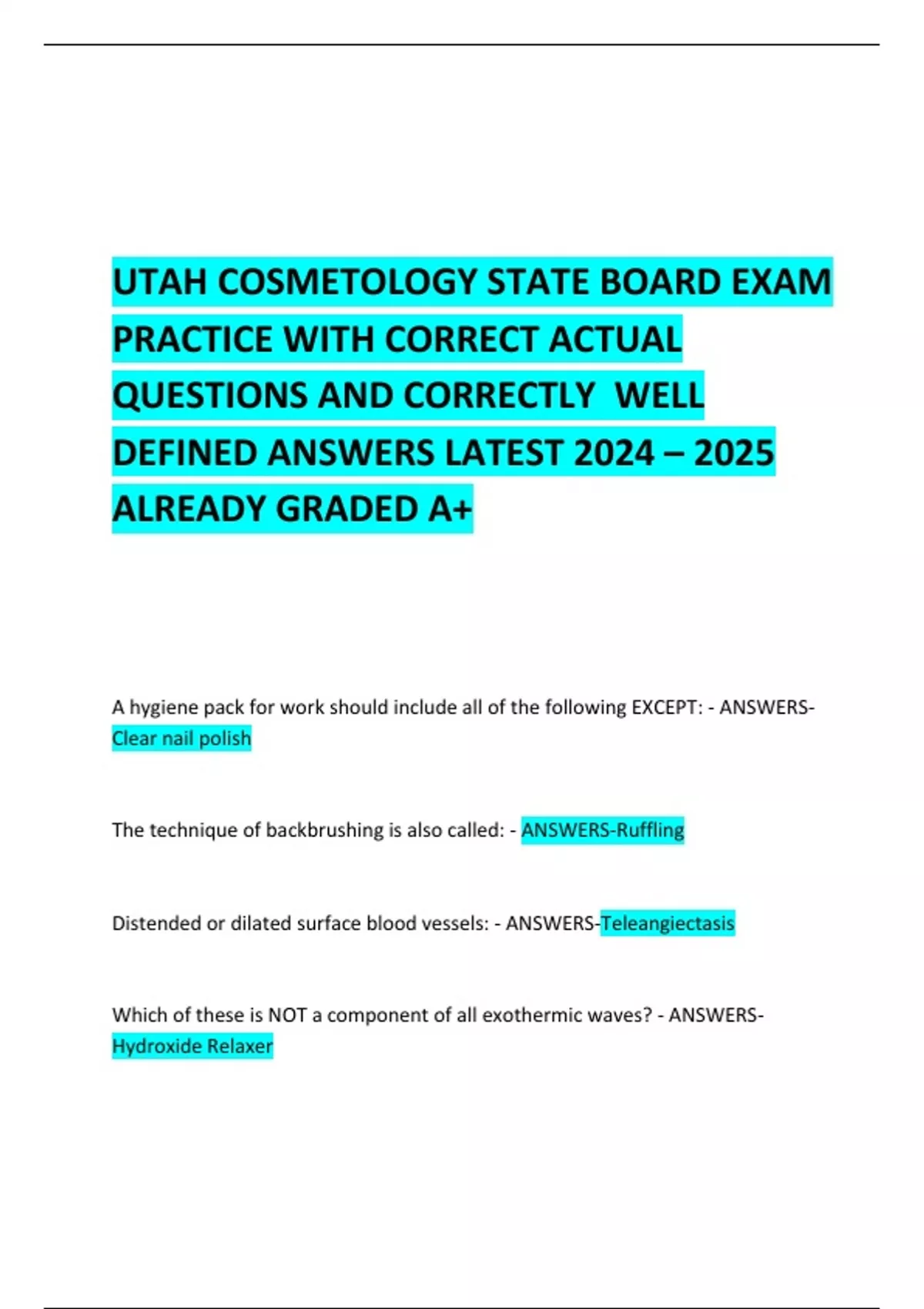 UTAH COSMETOLOGY STATE BOARD EXAM PRACTICE WITH CORRECT ACTUAL QUESTIONS AND CORRECTLY WELL DEFINED ANSWERS LATEST 2024 – 2025 ALREADY GRADED A+