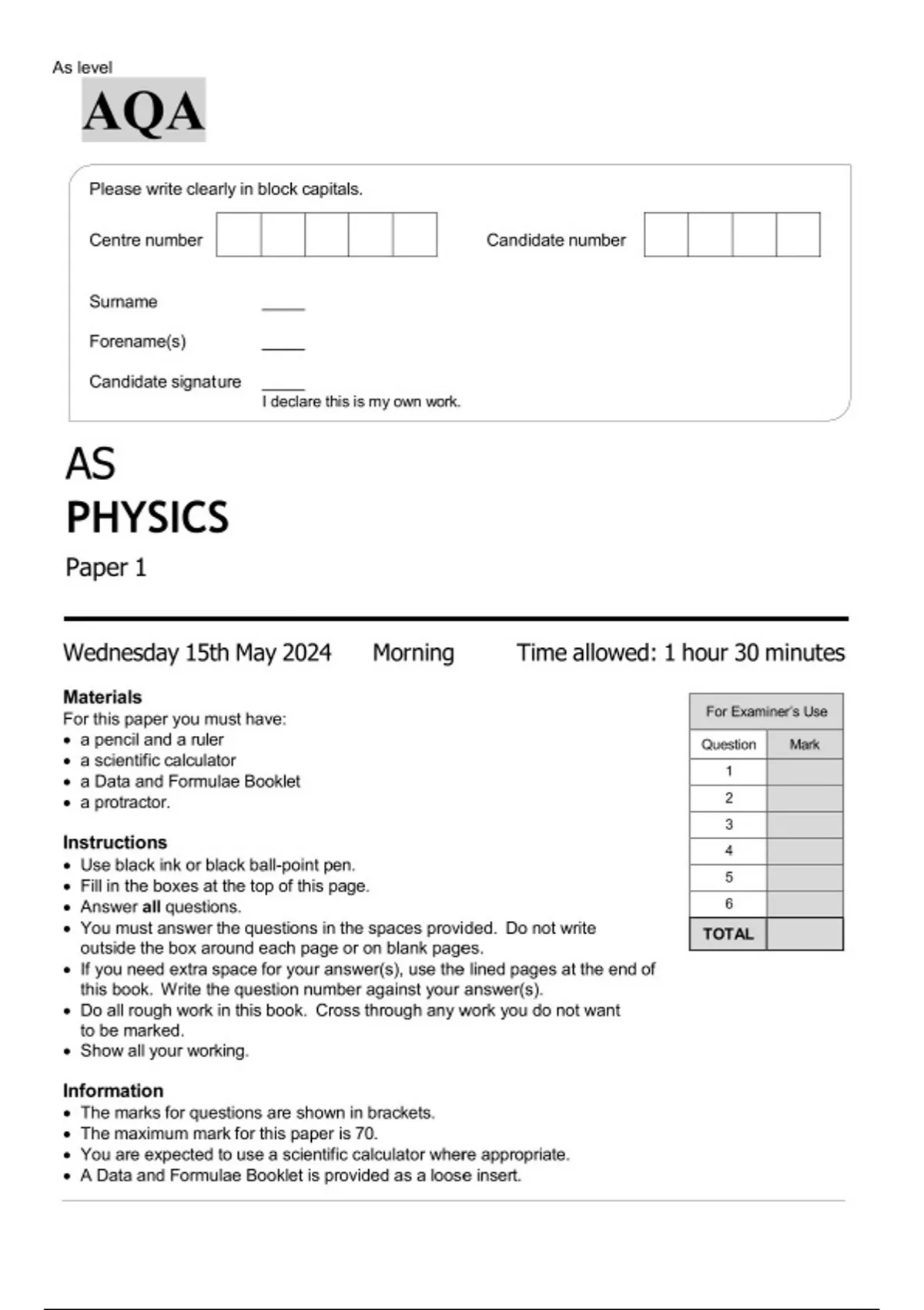 AQA AS PHYSICS Paper 1 JUNE 2024 QUESTION PAPER