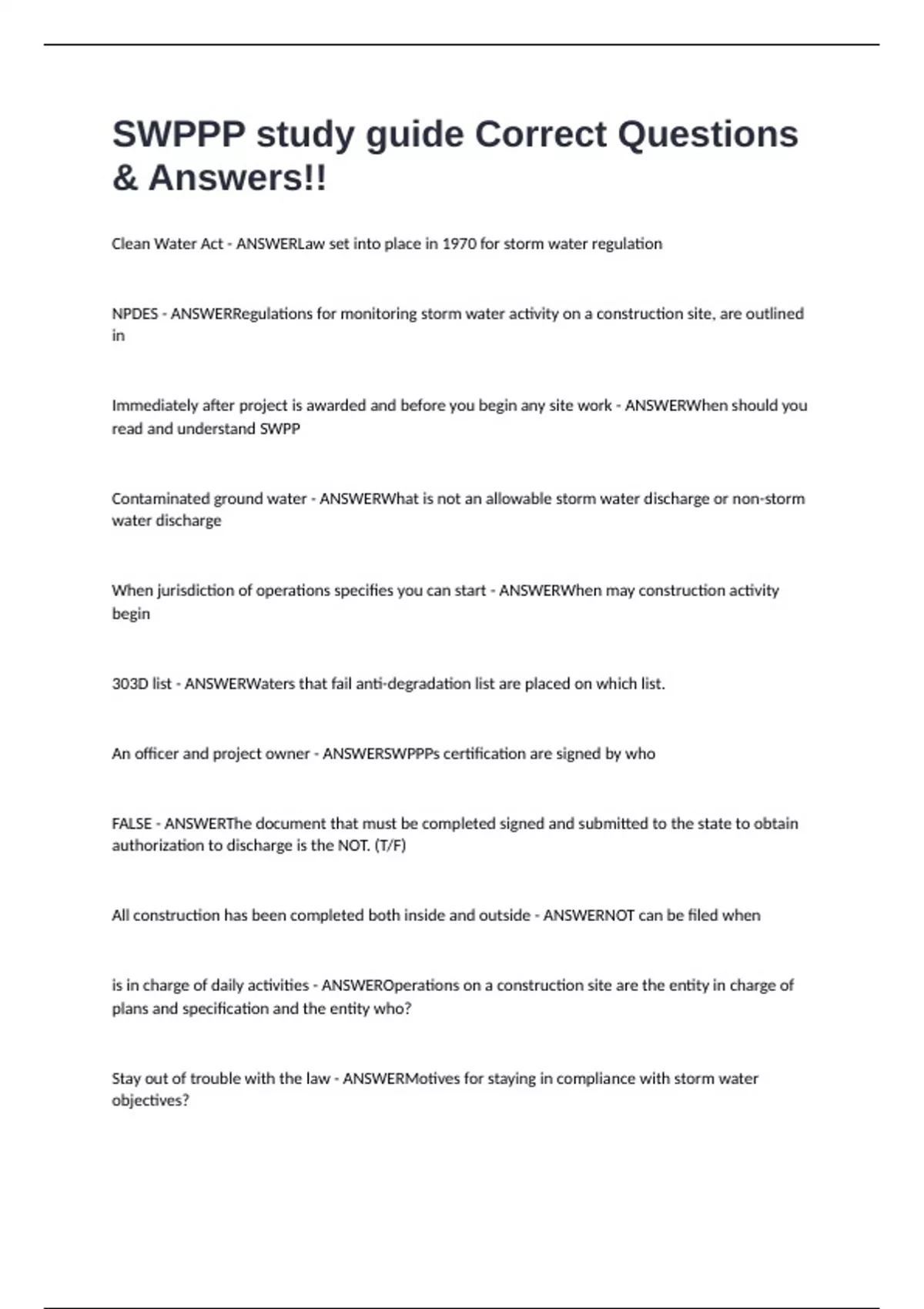 Clean Water Act - ANSWERLaw set into place in 1970 for storm water regulation NPDES - ANSWERRegulations for monitoring storm water activity on a construction site, are outlined in Immediately after project is awarded and before you begin any site work - ANSWERWhen should you read and understand SWPP Contaminated ground water - ANSWERWhat is not an allowable storm water discharge or non-storm water discharge When jurisdiction of operations specifies you can start - ANSWERWhen may construction activity begin