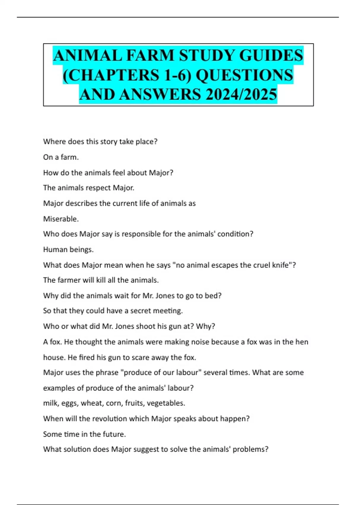 ANIMAL FARM STUDY GUIDES (CHAPTERS 1-6) QUESTIONS AND ANSWERS 2024/2025