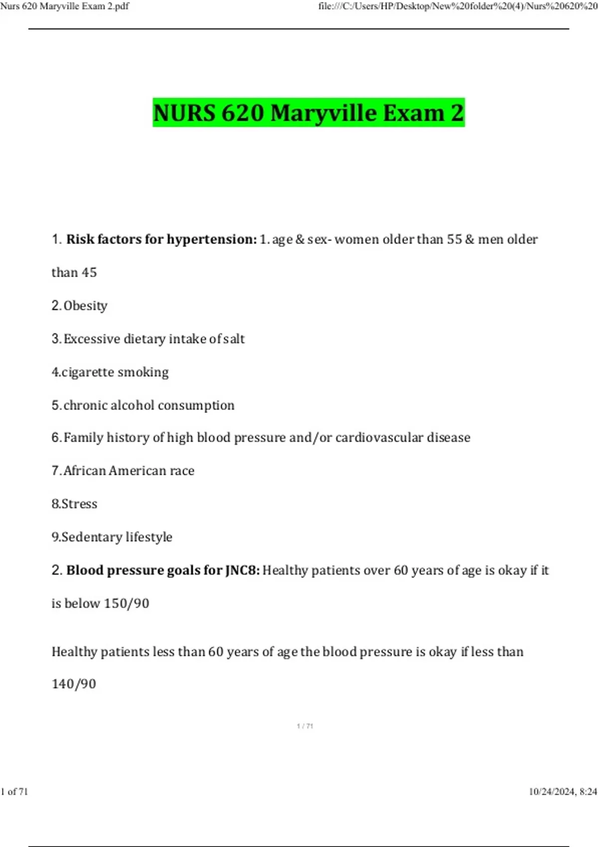 NURS 620 Maryville Exam 2 Questions and Verified Answers (2024 / 2025) 100% Guarantee Pass Risk factors for hypertension: 1. age & sex- women older than 55 & men older than 45 2. Obesity 3. Excessive dietary intake of salt ette smoking 5. chronic alcohol consumption 6. Family history of high blood pressure and/or cardiovascular disease 7. African American race 8.Stress 9.Sedentary lifestyle 2. Blood pressure goals for JNC8: Healthy patients over 60 years of age is okay if it is below 150/90 Healthy patients less than 60 years of age the blood pressure is okay if less than 140/90