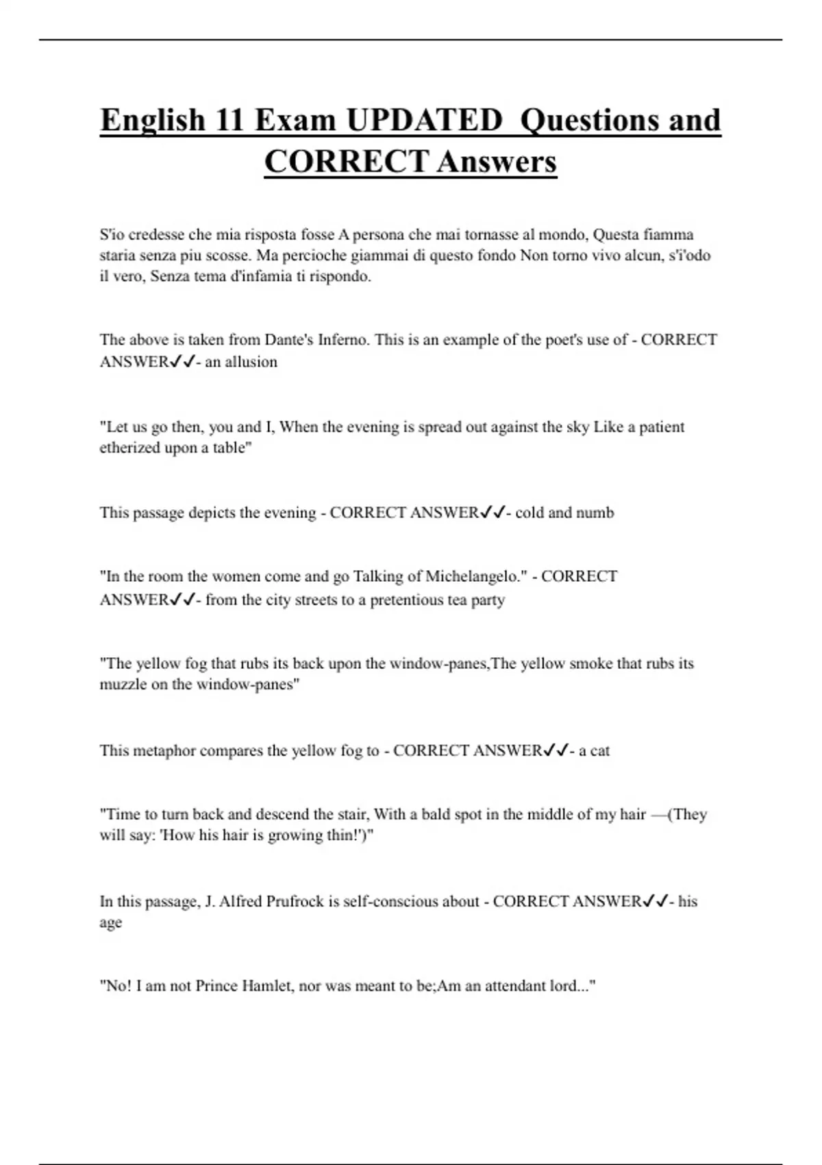 English 11 Exam UPDATED Questions and CORRECT Answers S'io credesse che mia risposta fosse A persona che mai tornasse al mondo, Questa fiamma staria senza piu scosse. Ma percioche giammai di questo fondo Non torno vivo alcun, s'i'odo il vero, Senza tema d'infamia ti rispondo.