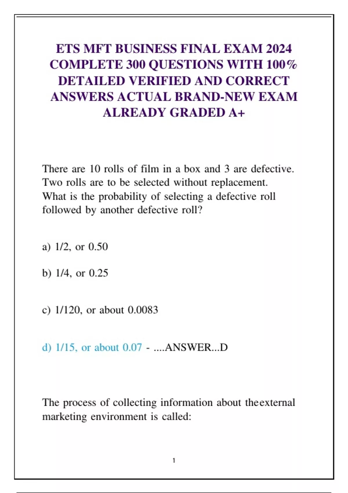 ETS MFT BUSINESS FINAL EXAM 2024 COMPLETE 300 QUESTIONS WITH 100% DETAILED VERIFIED AND CORRECT ANSWERS ACTUAL BRAND-NEW EXAM ALREADY GRADED A+