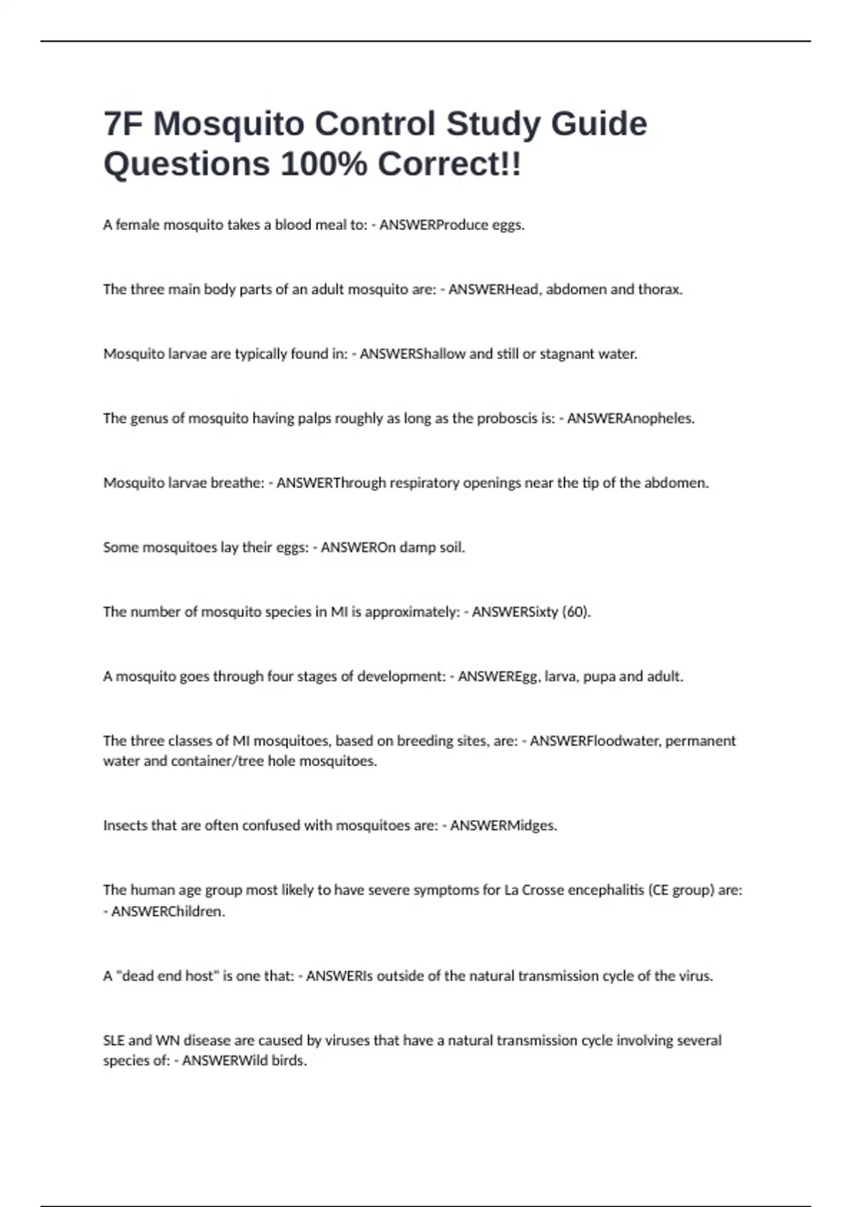 Mosquito larvae are typically found in: - ANSWERShallow and still or stagnant water.