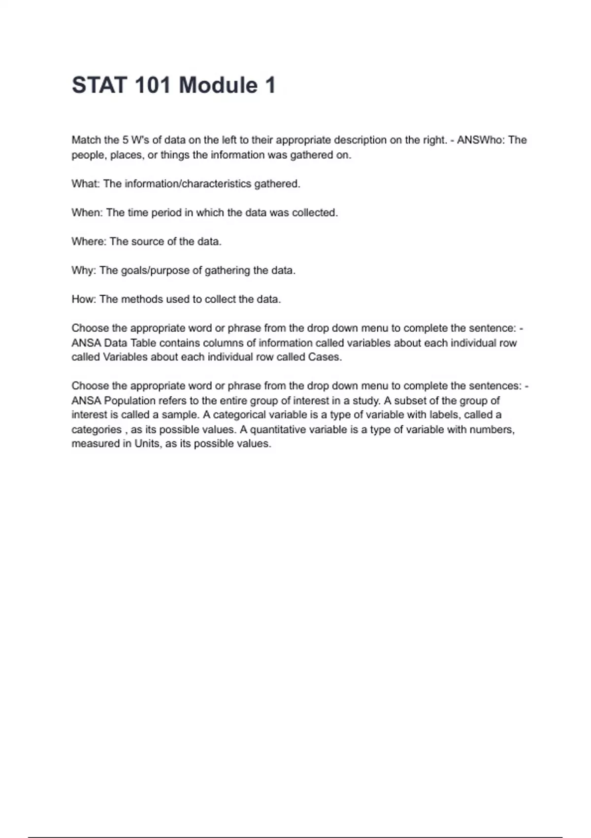 STAT 101 Module 1 Questions and Answers Graded A+ 2024/2025