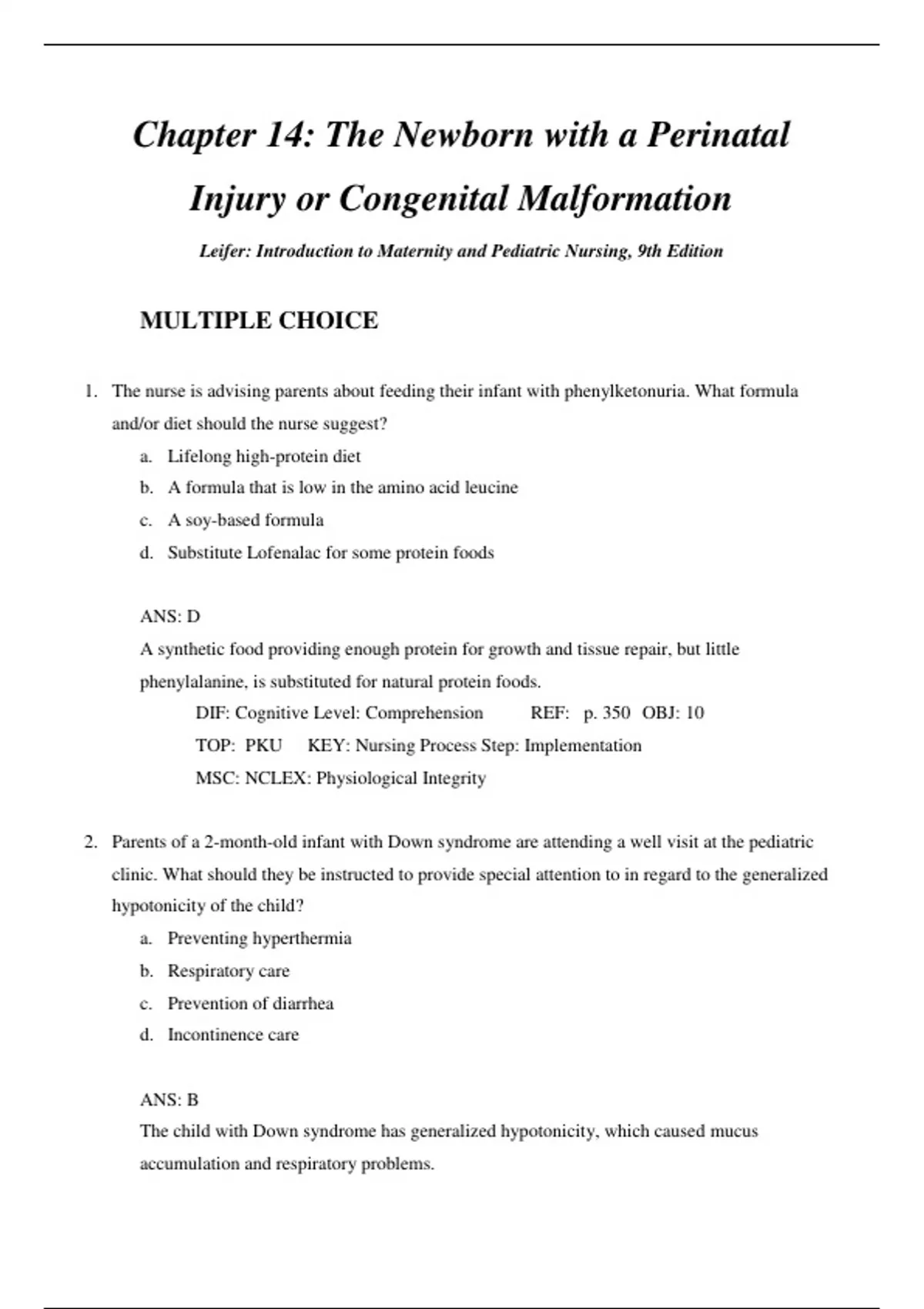 MULTIPLE CHOICE 1. The nurse is advising parents about feeding their infant with phenylketonuria. What formula and/or diet should the nurse suggest? a. Lifelong high-protein diet b. A formula that is low in the amino acid leucine c. A soy-based formula d. Substitute Lofenalac for some protein foods ANS: D A synthetic food providing enough protein for growth and tissue repair, but little phenylalanine, is substituted for natural protein foods. DIF: Cognitive Level: Comprehension REF: p. 350 OBJ: 10 TOP: PKU KEY: Nursing Process Step: Implementation MSC: NCLEX: Physiological Integrity 2. Parents of a 2-month-old infant with Down syndrome are attending a well visit at the pediatric clinic. What should they be instructed to provide special attention to in regard to the generalized hypotonicity of the child? a. Preventing hyperthermia b. Respiratory care c. Prevention of diarrhea d. Incontinence care ANS: B The child with Down syndrome has generalized hypotonicity, which caused mucus accumulation and respiratory problems. DIF: Cognitive Level: Application REF: p. 353 OBJ: 11 TOP: Down Syndrome KEY: Nursing Process Step: Implementation MSC: NCLEX: Physiological Integrity: Reduction of Risk 3. What would the nurse include when instructing parents about positioning their toddler who has just had a body spica cast applied? a. Prop the child upright with pillows for meals. b. Use the bar between the legs to turn the child. c. Put the child on her abdomen to sleep. d. Change the child‘s position frequently.