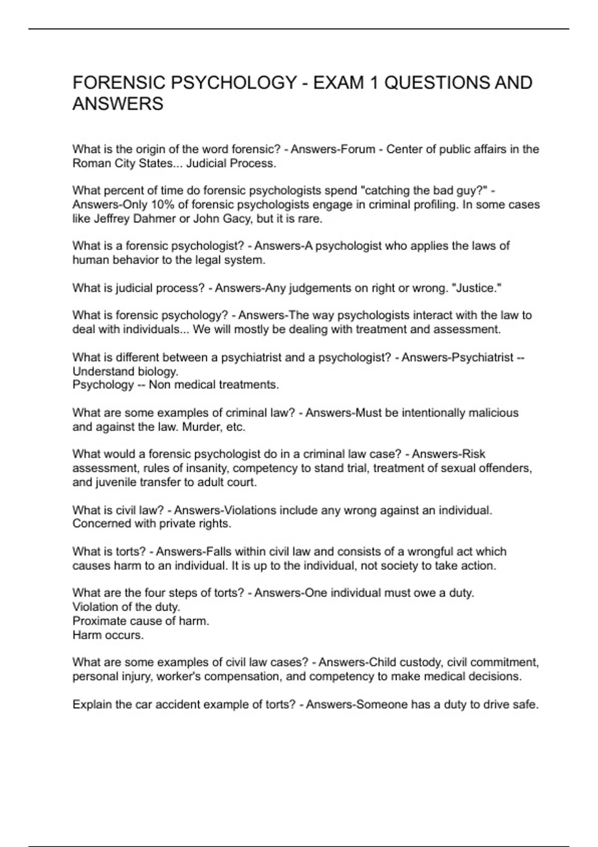 FORENSIC PSYCHOLOGY - EXAM 1 QUESTIONS AND