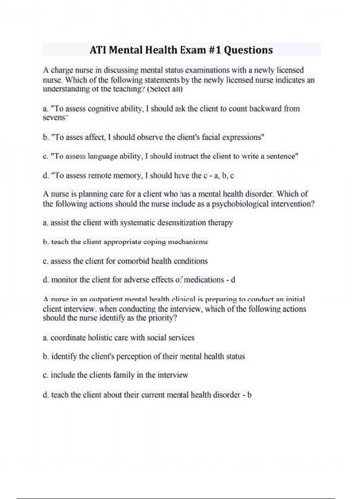 A charge nurse in discussing mental status examinations with a newly licensed nurse. Which of the following statements by the newly licensed nurse indicates an understanding of the teaching? (Select all) a. "To assess cognitive ability, I should ask the client to count backward from sevens" b. "To asses affect, I should observe the client's facial expressions" c. "To assess language ability, I should instruct the client to write a sentence" d. "To assess remote memory, I should have the c - a, b, c A nurse is planning care for a client who has a mental health disorder. Which of the following actions should the nurse include as a psychobiological intervention? a. assist the client with systematic desensitization therapy b. teach the client appropriate coping mechanisms c. assess the client for comorbid health conditions d. monitor the client for adverse effects of medications - d A nurse in an outpatient mental health clinical is preparing to conduct an initial client interview. when conducting the interview, which of the following actions should the nurse identify as the priority? a. coordinate holistic care with social services b. identify the client's perception of their mental health status c. include the clients family in the interview d. teach the client about their current mental health disorder - b A nurse is planning a peer group discussion about the DSM-5. Which of the following information is appropriate to include in the discussion? (Select all) a. the DSM-5 includes client education handouts for mental health disorders b. the DSM-5 establishes diagnostic criteria for individual mental health disorders c. the DSM-5 indicates recommended pharmacological treatment for mental health disorders d. the DSM-5 assists nurses in planning care for client's who have mental health disorder - b, c, e A nurse in an emergency mental health facility is caring for a group of clients. The nurse should identify that which of the following clients requires a temporary emergency admission? a. a client who has schizophrenia with delusions of grandeur b. a client who has manifestations of depression and attempted suicide a year ago c. a client who has borderline personality disorder and assaulted a homeless man with a metal rod d. a client who has bipolar disorder and paces quickly around the - c A nurse decides to put a client who has a psychotic disorder in seclusion overnight because the unit is very-short staffed, and the client frequently fights with other clients. The nurse's actions are an example of which of the following torts? a. invasion of privacy b. false imprisonment c. assault d. battery - b A client tells a nurse, "Don't tell anyone, but I hid a sharp knife under my mattress in order to protect myself from my roommate, who is always threatening me." Which of the following actions should the nurse take? a. keep the client's communication confidential, but talk to the client daily, using therapeutic communication to convince them to admit to hiding the knife b. keep the client's communication confidential, but watch the client and their roommate closely c. tell the client that - c A nurse is caring for a client who is in mechanical restraints. Which of the following statements should the nurse include in the documentation? (Select all) a. client ate most of their breakfast b. client was offered 8 oz of water every hr c. client shouted obscenities at assistive personnel d. client received chlorpromazine 15 mg by mouth at 1000 e. client acted out after lunch - b, c, d A nurse hears a newly licensed nurse discussing a client's hallucinations in the hallway with another nurse. Which of the following actions should the nurse take first? a. notify the nurse manager b. tell the nurse to stop discussing the behavior c. provide an in-service program about confidentiality d. complete an incident report - b A charge nurse is conducting a class on therapeutic communication with a group of newly licensed nurses. Which of the following aspects of communication should the nurse identify as a component of verbal communication? a. personal space b. posture c. eye contact. d. intonation - d A nurse in an acute mental health facility is communicating with a client. The client states, "I can't sleep. I stay up all night." The nurse responds, "You are having difficulty sleeping?" Which of the following therapeutic communication techniques is the nurse demonstrating? a. offering general leads b. summarizing c. focusing d. restating - d A nurse is communicating with a client who was admitted for treatment of a substance use disorder. Which of the following communication techniques should the nurse identify as a barrier to therapeutic communication? a. offering advice b. reflecting c. listening attentively d. giving information - a A nurse is caring for a client who has anorexia nervosa. Which of the following examples demonstrates the nurse's use of interpersonal communication? a. the nurse discusses the client's weight loss during a health care team meeting b. the nurse examines their own personal feelings about clients who have AN c. the nurse asks the client about personal body image perception d. the nurse presents an educational session about AN to a large group of adolescents - c A nurse is talking with the caregiver of a child who has demonstrated recent changes in behavior and mood. When the caregiver of the child asks the nurse for reassurance about their child's condition, which of the following responses should the nurse make? a. "I think your child is getting better. What have you noticed?" b. "I'm sure everything will be okay. It just takes time to heal" c. "I'm not sure what's wrong. Have you asked the doctor about your concerns?" d. "I understand you're c - d A nurse is caring for a client who smokes and has lung cancer. The client reports "I'm coughing because I have that cold everyone has been getting." The nurse should identify that the client is using which of the following defense mechani