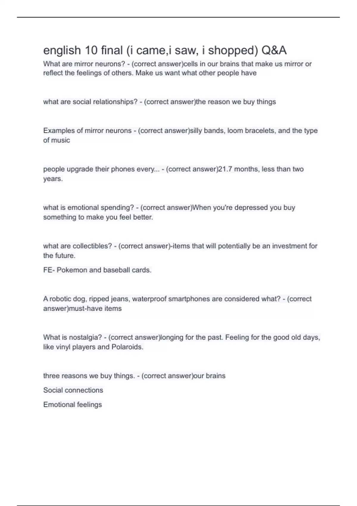 english 10 final (i came,i saw, i shopped) Q&A