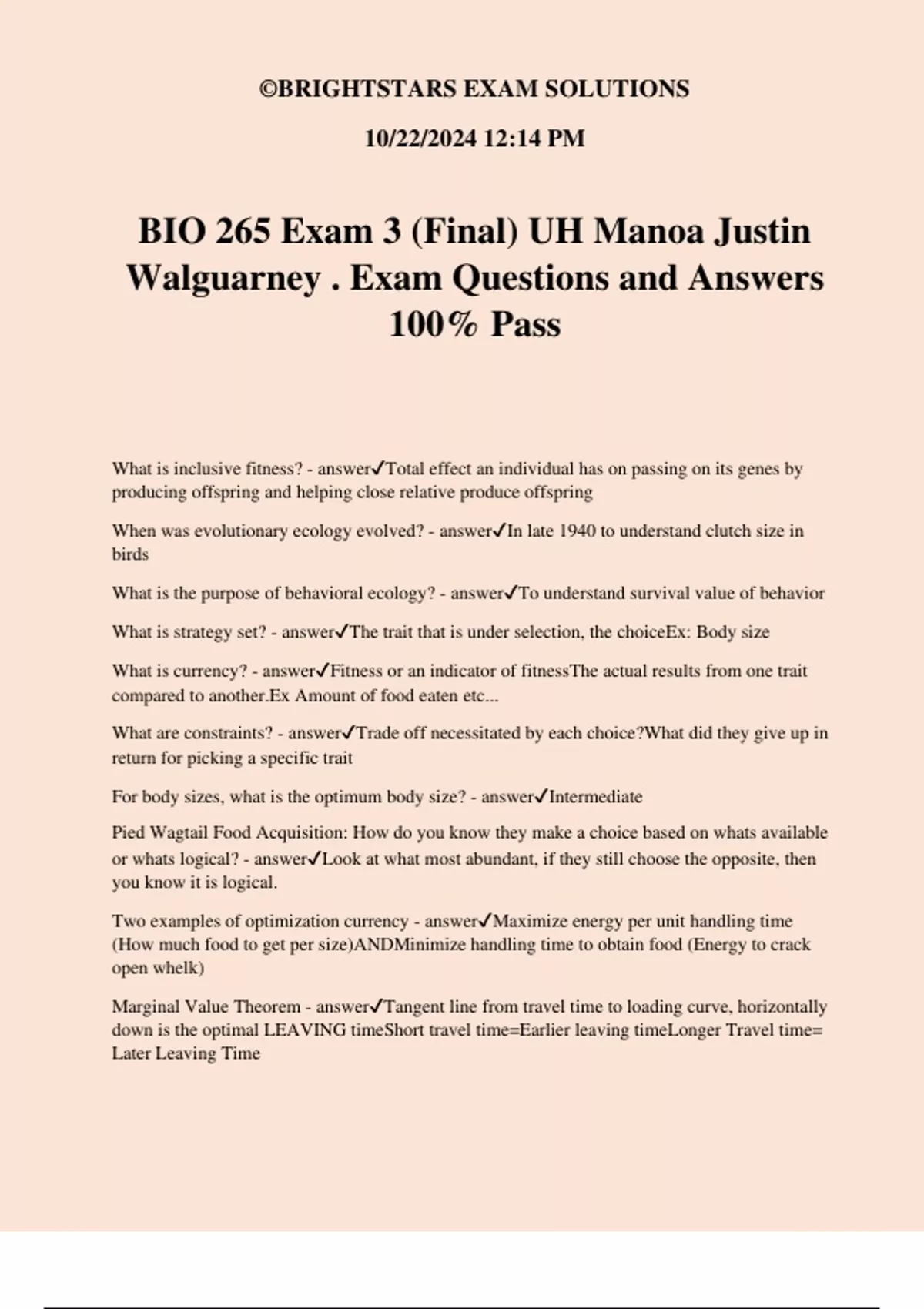 ©BRIGHTSTARS EXAM SOLUTIONS 10/22/2024 12:14 PM BIO 265 Exam 3 (Final) UH Manoa Justin Walguarney . Exam Questions and Answers 100% Pass What is inclusive fitness? - answerTotal effect an individual has on passing on its genes by producing offspring and helping close relative produce offspring When was evolutionary ecology evolved? - answerIn late 1940 to understand clutch size in birds What is the purpose of behavioral ecology? - answerTo understand survival value of behavior What is strategy set? - answerThe trait that is under selection, the choiceEx: Body size What is currency? - answerFitness or an indicator of fitnessThe actual results from one trait compared to another.Ex Amount of food eaten etc... What are constraints? - answerTrade off necessitated by each choice?What did they give up in return for picking a specific trait For body sizes, what is the optimum body size? - answerIntermediate Pied Wagtail Food Acquisition: How do you know they make a choice based on whats available or whats logical? - answerLook at what most abundant, if they still choose the opposite, then you know it is logical. Two examples of optimization currency - answerMaximize energy per unit handling time (How much food to get per size)ANDMinimize handling time to obtain food (Energy to crack open whelk) Marginal Value Theorem - answerTangent line from travel time to loading curve, horizontally down is the optimal LEAVING timeShort travel time=Earlier leaving timeLonger Travel time= Later Leaving Time ©BRIGHTSTARS EXAM SOLUTIONS 10/22/2024 12:14 PM What are Haustoria? - answerPegs of absorptive tissue inserted into vascular system of plant host What determines the number of haustoria? - answerLength of coiled stem What is reproductive effort? - answerRelative amount of energy devoted to reproduction Trade off between size and reproduction? - answerBigger can survive better, but wont be able to produce as many.Smaller: Can produce a lot but wont be able to survive as well What happens if we modify the amount of NATURAL clutch size? - answerReduces fitness How to tell when is the optimal age for first reproduction or Territory size area? - answerWhen benefits outweighs cost (Largest Margin) How to determining the optimum group size in a graph? - answerAlways look at the maximum feeding size to see flock size..W/O Feeding, just look at intermediate size In a group size problem graph, what happens if you add a predator? - answerYou need to invest more time in scanning, so the optimal size shifts up a bit along with feeding Consequences for Shorter Vs longer Sperm? - answerShorter sperm might not have enough energy to travelLonger sperm might not fit in al sperm size is dependent on female tubule size What is Parthenogenesis? - answerDevelopment of a new individual from an UNFERTILIZED EGG Some parthenogenic species only need sperm to trigger reproduction, BUT ______ - answerThe genotype is still identical to female What is two fold cost of sex? - answerWhen sexual females will only have 1/2 amount of daughters as asexual females.Due to 50% dilution of genetics from male gametes Which will increase faster? Sexual or Asexual? - answerAsexual Some strong advantages of Sexual reproduction - answer1) Error Correction 2) Genetic Variation 3) Unique genetic mutations What is DNA repair hypothesis? - answerSex without reproduction. When there is a disruption to the DNA, the DNA repair mechanism can try correct the error.Reduces the change of homologous deleterious alleles