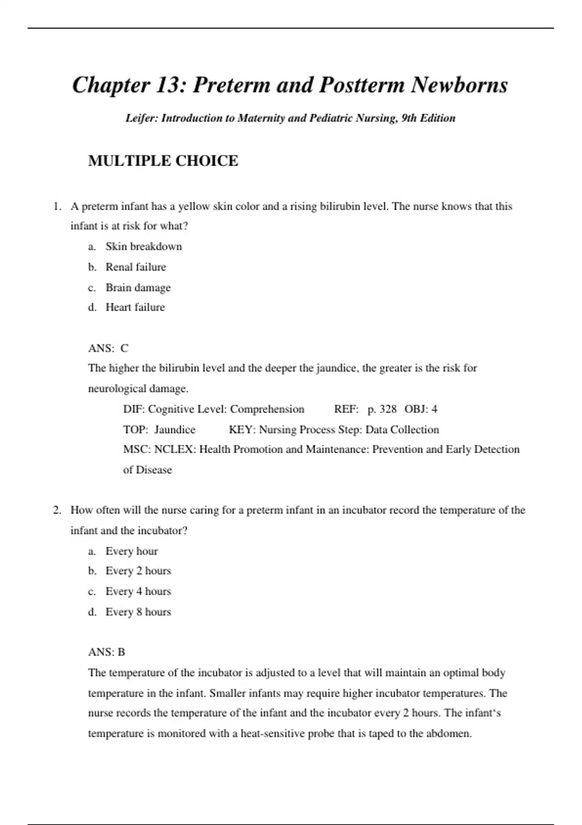 MULTIPLE CHOICE 1. A preterm infant has a yellow skin color and a rising bilirubin level. The nurse knows that this infant is at risk for what? a. Skin breakdown b. Renal failure c. Brain damage d. Heart failure ANS: C The higher the bilirubin level and the deeper the jaundice, the greater is the risk for neurological damage. DIF: Cognitive Level: Comprehension REF: p. 328 OBJ: 4 TOP: Jaundice KEY: Nursing Process Step: Data Collection MSC: NCLEX: Health Promotion and Maintenance: Prevention and Early Detection of Disease 2. How often will the nurse caring for a preterm infant in an incubator record the temperature of the infant and the incubator? a. Every hour b. Every 2 hours c. Every 4 hours d. Every 8 hours ANS: B The temperature of the incubator is adjusted to a level that will maintain an optimal body temperature in the infant. Smaller infants may require higher incubator temperatures. The nurse records the temperature of the infant and the incubator every 2 hours. The infant‘s temperature is monitored with a heat-sensitive probe that is taped to the abdomen. DIF: Cognitive Level: Comprehension REF: p. 329 OBJ: 5 TOP: Thermoregulation KEY: Nursing Process Step: Implementation MSC: NCLEX: Physiological Integrity: Reduction of Risk 3. Why is the postterm neonate at risk for cold stress? a. Inadequate vernix caseosa b. Hypoxia from a deteriorated placenta c. Polycythemia d. Fat stores have been used in utero for nourishment