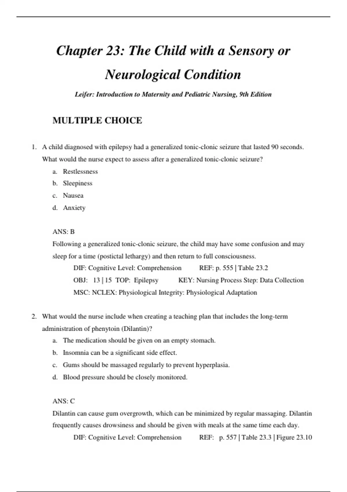 MULTIPLE CHOICE 1. A child diagnosed with epilepsy had a generalized tonic-clonic seizure that lasted 90 seconds. What would the nurse expect to assess after a generalized tonic-clonic seizure? a. Restlessness b. Sleepiness c. Nausea d. Anxiety ANS: B Following a generalized tonic-clonic seizure, the child may have some confusion and may sleep for a time (postictal lethargy) and then return to full consciousness. DIF: Cognitive Level: Comprehension REF: p. 555 | Table 23.2 OBJ: 13 | 15 TOP: Epilepsy KEY: Nursing Process Step: Data Collection MSC: NCLEX: Physiological Integrity: Physiological Adaptation 2. What would the nurse include when creating a teaching plan that includes the long-term administration of phenytoin (Dilantin)? a. The medication should be given on an empty stomach. b. Insomnia can be a significant side effect. c. Gums should be massaged regularly to prevent hyperplasia. d. Blood pressure should be closely monitored. ANS: C Dilantin can cause gum overgrowth, which can be minimized by regular massaging. Dilantin frequently causes drowsiness and should be given with meals at the same time each day. DIF: Cognitive Level: Comprehension REF: p. 557 | Table 23.3 | Figure 23.10 OBJ: 13 TOP: Epilepsy KEY: Nursing Process Step: Implementation MSC: NCLEX: Physiological Integrity: Pharmacological Therapies 3. The nurse observes that the legs of a child with cerebral palsy cross involuntarily, and the child exhibits jerky movements with his arms as he tries to eat. The nurse recognizes that he has which type of cerebral palsy? a. Athetoid b. Ataxic c. Spastic d. Mixed