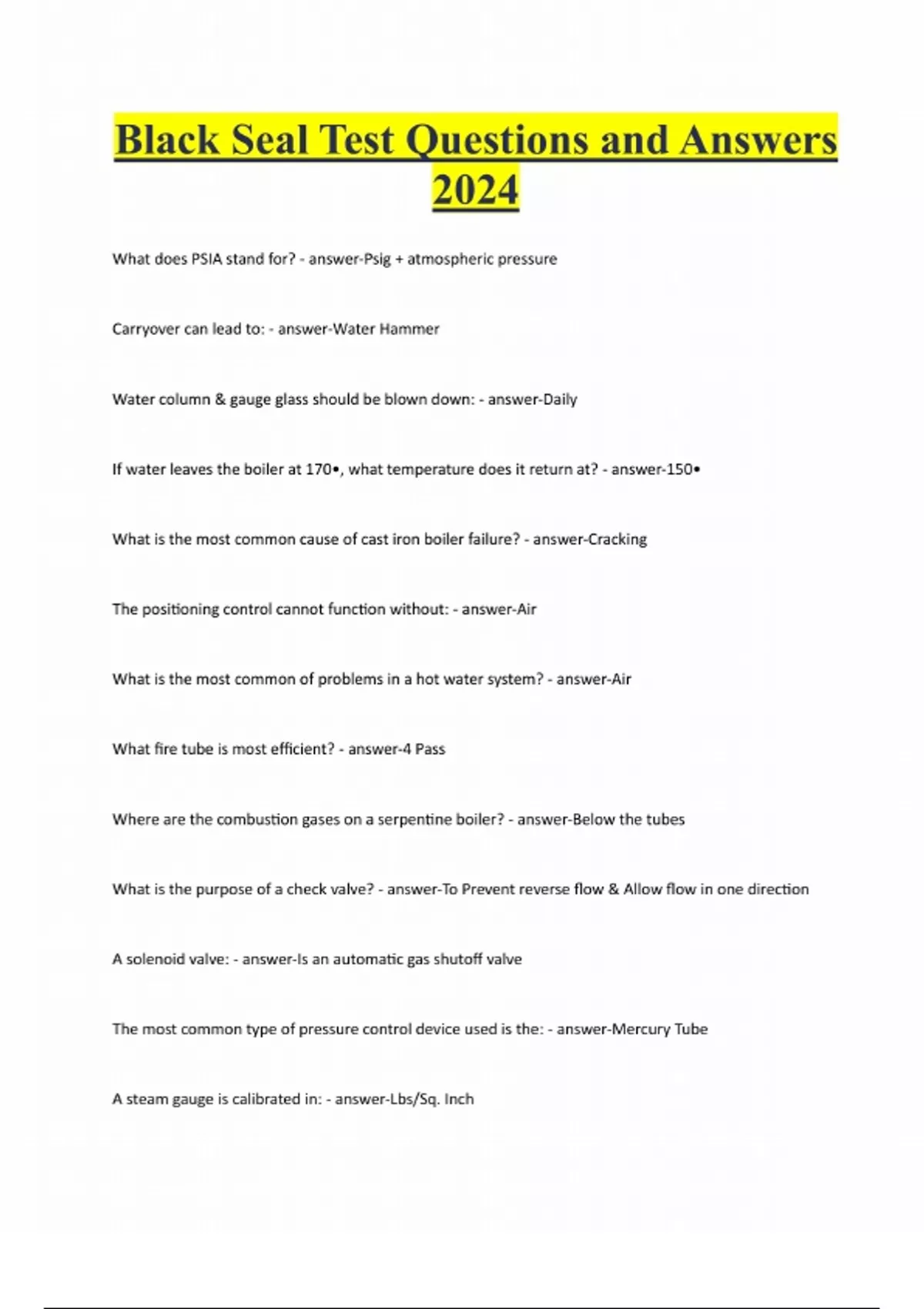 Black Seal Test Questions and Answers 2024 What does PSIA stand for? - answer-Psig + atmospheric pressure Carryover can lead to: - answer-Water Hammer Water column & gauge glass should be blown down: - answer-Daily If water leaves the boiler at 170•, what temperature does it return at? - answer-150• What is the most common cause of cast iron boiler failure? - answer-Cracking The positioning control cannot function without: - answer-Air What is the most common of problems in a hot water system? - answer-Air What fire tube is most efficient? - answer-4 Pass Where are the combustion gases on a serpentine boiler? - answer-Below the tubes What is the purpose of a check valve? - answer-To Prevent reverse flow & Allow flow in one direction