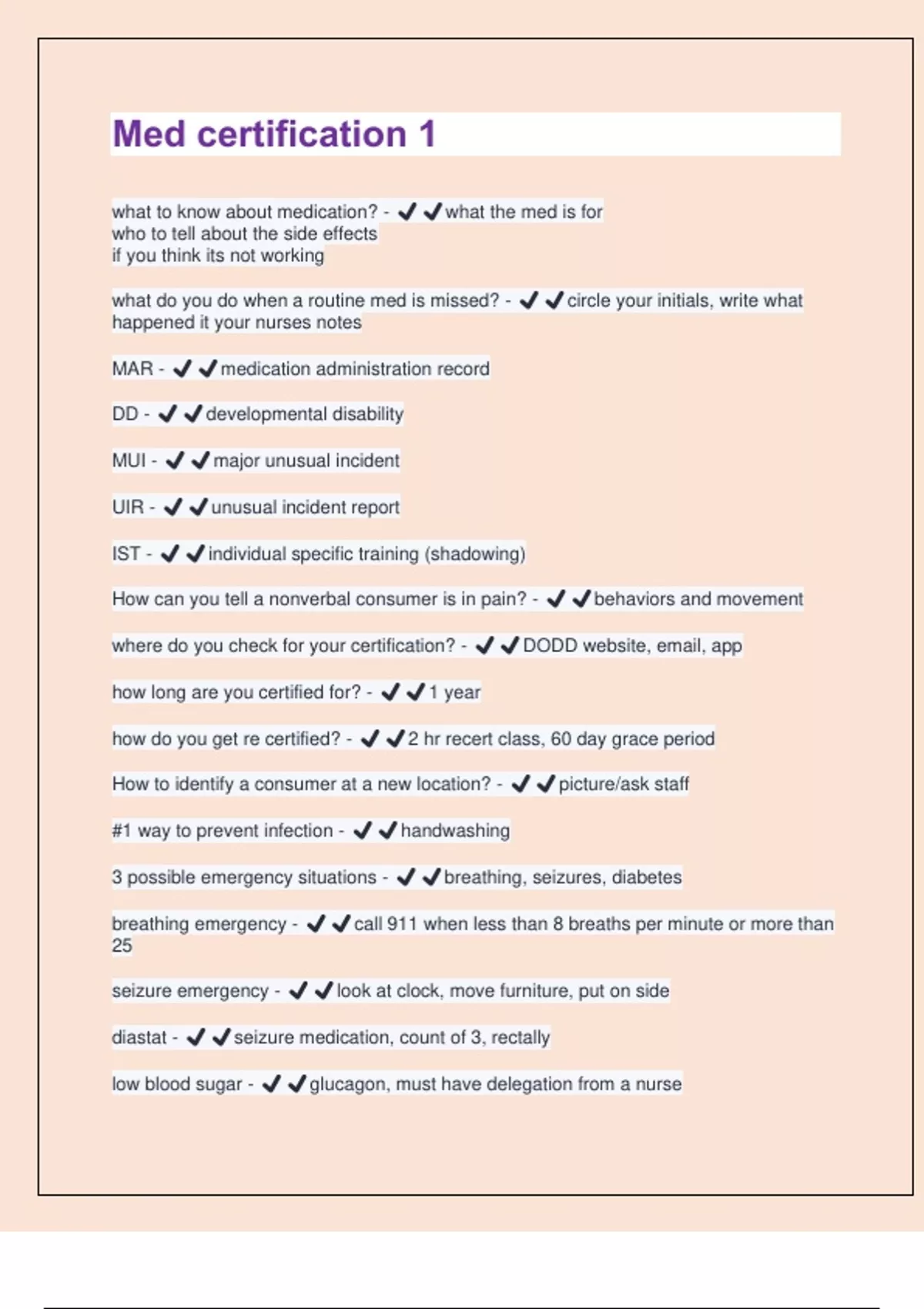 what to know about medication? - ️️what the med is for who to tell about the side effects if you think its not working what do you do when a routine med is missed? - ️️circle your initials, write what happened it your nurses notes MAR - ️️medication administration record DD - ️️developmental disability MUI - ️️major unusual incident UIR - ️️unusual incident report IST - ️️individual specific training (shadowing) How can you tell a nonverbal consumer is in pain? - ️️behaviors and movement where do you check for your certification? - ️️DODD website, email, app how long are you certified for? - ️️1 year how do you get re certified? - ️️2 hr recert class, 60 day grace period How to identify a consumer at a new location? - ️️picture/ask staff #1 way to prevent infection - ️️handwashing 3 possible emergency situations - ️️breathing, seizures, diabetes breathing emergency - ️️call 911 when less than 8 breaths per minute or more than 25 seizure emergency - ️️look at clock, move furniture, put on side diastat - ️️seizure medication, count of 3, rectally low blood sugar - ️️glucagon, must have delegation from a nurseHow to correct an error on MAR - ️️Single Line Initial Date Error 6 consumer rights - ️️Dose Route Time Individual Med Document