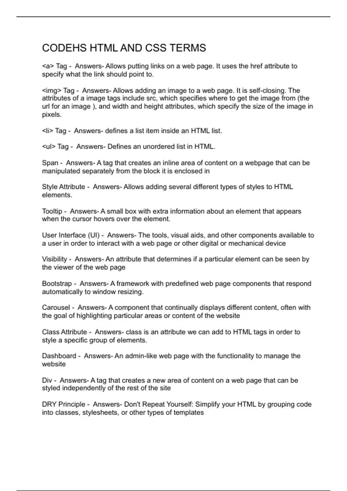 Span - Answers- A tag that creates an inline area of content on a webpage that can be