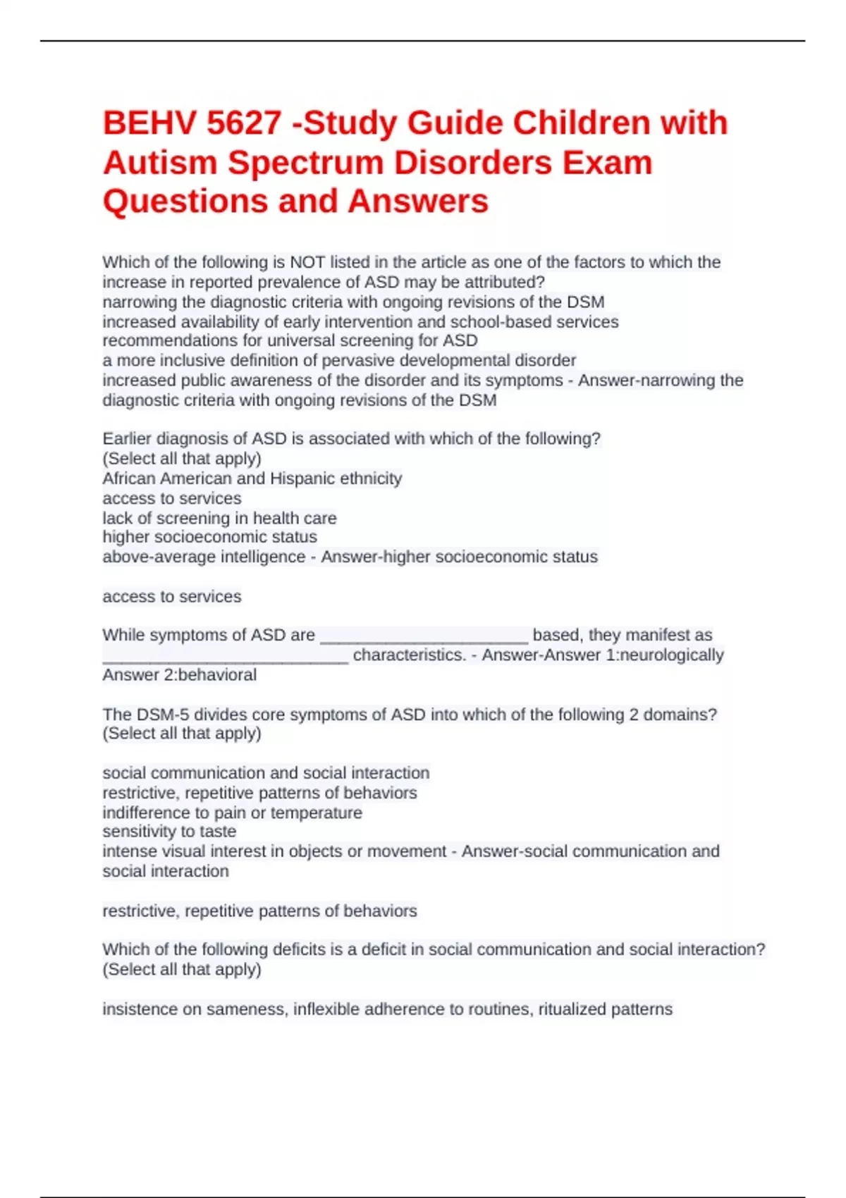 BEHV 5627 -Study Guide Children with Autism Spectrum Disorders Exam Questions and Answers