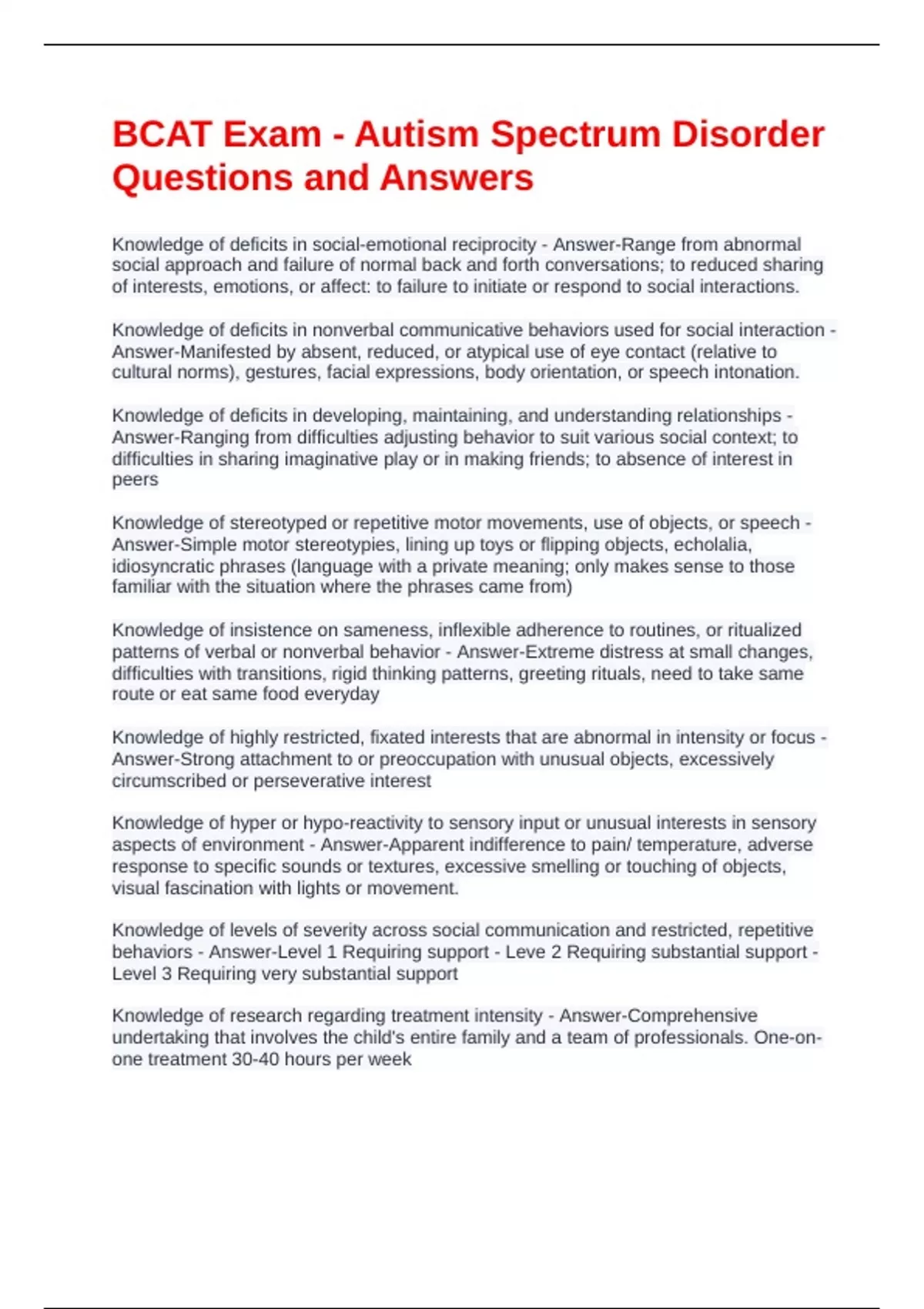 BCAT Exam - Autism Spectrum Disorder Questions and Answers