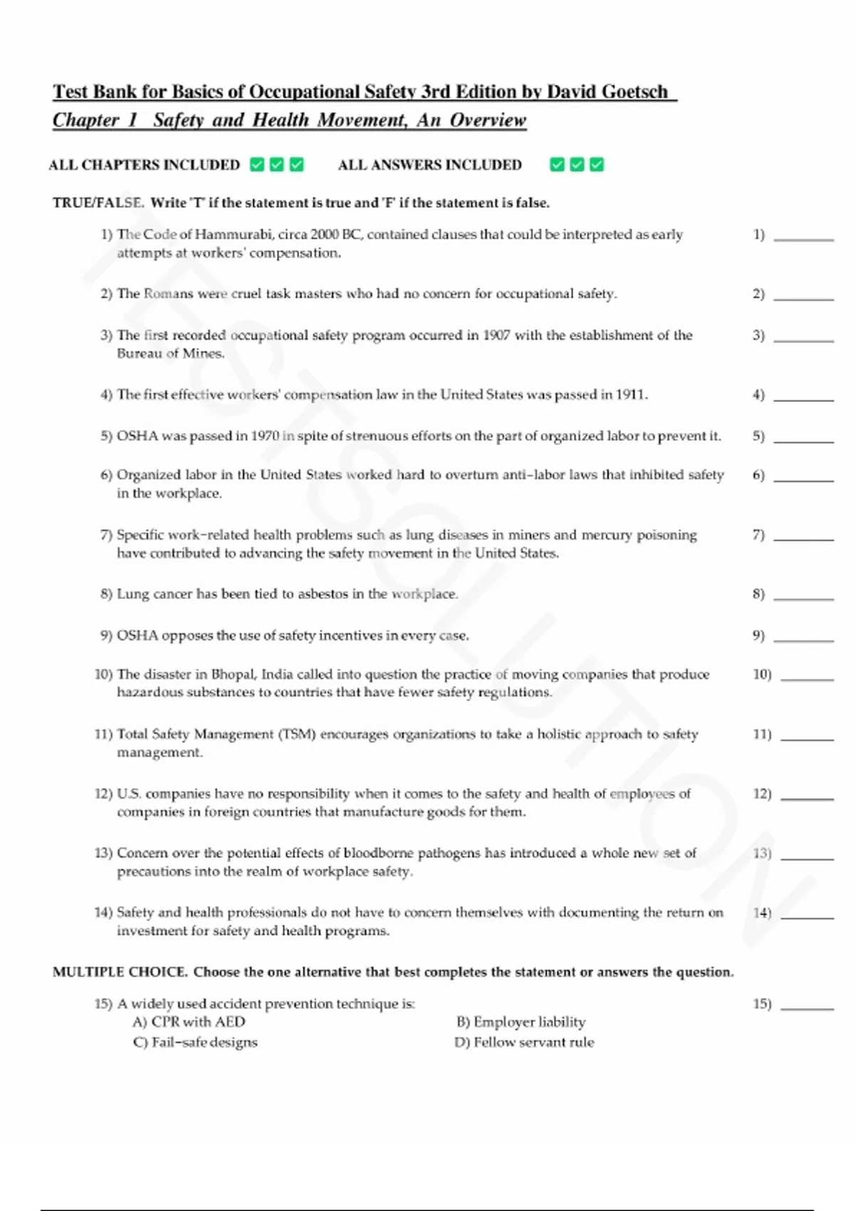 Test Bank for Basics of Occupational Safety 3rd Edition by David Goetsch, All Chapters 1-20 |Complete Question and Answers.