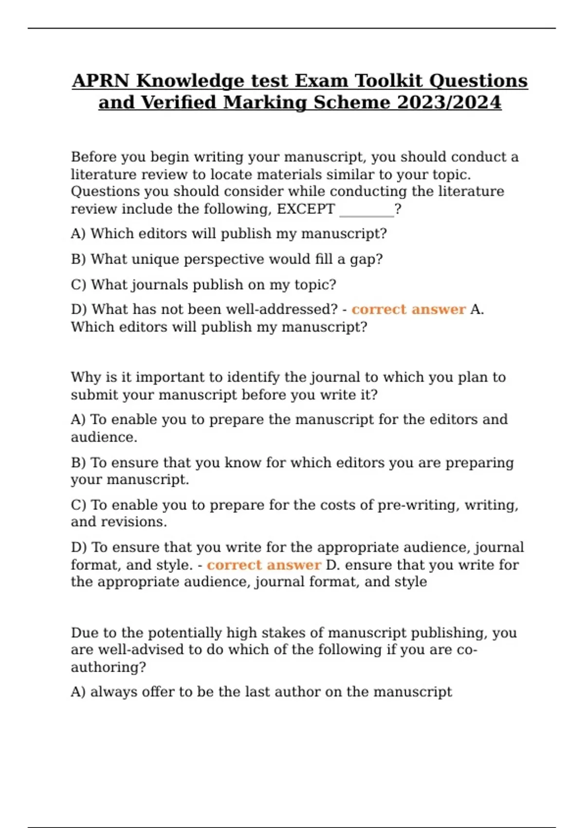 APRN Knowledge test Exam Toolkit Questions and Verified Marking Scheme 2023/2024 Before you begin writing your manuscript, you should conduct a literature review to locate materials similar to your topic. Questions you should consider while conducting the literature review include the following, EXCEPT ________? A) Which editors will publish my manuscript? B) What unique perspective would fill a gap? C) What journals publish on my topic? D) What has not been well-addressed? - correct answer A. Which editors will publish my manuscript? Why is it important to identify the journal to which you plan to submit your manuscript before you write it? A) To enable you to prepare the manuscript for the editors and audience. B) To ensure that you know for which editors you are preparing your manuscript. C) To enable you to prepare for the costs of pre-writing, writing, and revisions. D) To ensure that you write for the appropriate audience, journal format, and style. - correct answer D. ensure that you write for the appropriate audience, journal format, and style Due to the potentially high stakes of manuscript publishing, you are well-advised to do which of the following if you are co-authoring? A) always offer to be the last author on the manuscript B) avoid co-authoring at all costs as it leads to problems C) write a lengthy contract ensuring that you are lead D) negotiate both authorship and lineup during pre-writing - correct answer D. negotiate both authorship and lineup during prewriting Which of the following are the major elements to consider during the writing stage? A) Journal language, journal specialty, style and format, citing sources, grammar and spelling, type of journal, proofreading, and getting feedback. B) Organization, sentence structure, style, journal language, grammar and spelling, citing sources, proofreading, and type of journal. C) Organization, sentence and paragraph structure, style and language, grammar and punctuation, citing sources, proofreading, and inviting feedback. D) Type of journal, manuscript submission process, organization, sentence and paragraph structure, grammar and spelling, and proofreading. - correct answer C. Organization, sentence and paragraph structure, style and language, grammar and punctuation, citing sources, proofreading, and inviting feedback. The ________ includes the standards, structure, formatting, style and other information that nursing manuscript writers usually follow. A) American Medical Association Manual of Style (2011) B) Publication Manual of the American Psychiatric Association (2013) C) Publication Manual of the American Psychological Association (2010) D) Publication Manual of the American Nursing Association (2011) - correct answer C) Publication Manual of the American Psychological Association (2010)