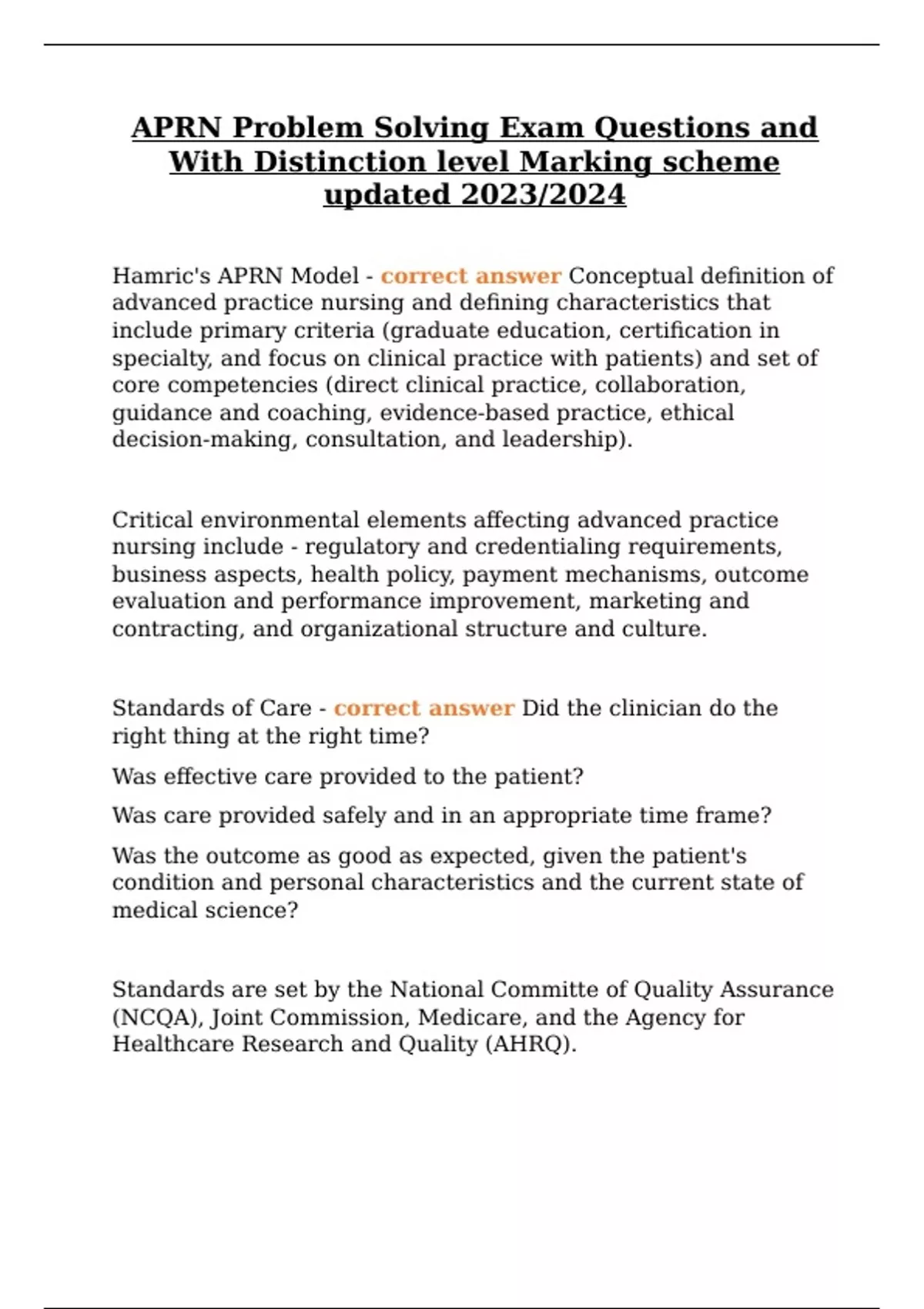 APRN Problem Solving Exam Questions and With Distinction level Marking scheme updated 2023/2024 Hamric's APRN Model - correct answer Conceptual definition of advanced practice nursing and defining characteristics that include primary criteria (graduate education, certification in specialty, and focus on clinical practice with patients) and set of core competencies (direct clinical practice, collaboration, guidance and coaching, evidence-based practice, ethical decision-making, consultation, and leadership). Critical environmental elements affecting advanced practice nursing include - regulatory and credentialing requirements, business aspects, health policy, payment mechanisms, outcome evaluation and performance improvement, marketing and contracting, and organizational structure and culture. Standards of Care - correct answer Did the clinician do the right thing at the right time? Was effective care provided to the patient? Was care provided safely and in an appropriate time frame? Was the outcome as good as expected, given the patient's condition and personal characteristics and the current state of medical science? Standards are set by the National Committe of Quality Assurance (NCQA), Joint Commission, Medicare, and the Agency for Healthcare Research and Quality (AHRQ). AANP - Standards of Care 1. Assessment of health status (health history, PE, identifying risks, ordering appropriate testing) 2. Diagnosis (critical thinking, analyzing data, differential diagnosis, establishing priorities) 3. Development of treatment plan (ordering additional tests, prescribing appropriate interventions, developing education plan, appropriate consults/referrals) 4. Implementation of plan (individualized, consistent with care plan, consistent with teaching and learning opportunities) 5. Follow up/Evaluation (determination of effectiveness of treatment plan with documentation of outcomes, modifying plan as necessary) HEDIS - correct answer Health Plan Employer Data and Information Set Set of performance measures set by the NCQA. Barriers to Advanced Practice Nursing - correct answer Inconsistent state-by-state regulations Physician "supervision" or "collaboration" requirements Invisible provider status through "incident to" billing Inability to order hospice, home health care, or skilled nursing services Unable to practice NP principles of care that is patient-centered, health-focused, and holistic within a particular setting due to role fulfillment constraints. In many clinical settings the medical model dominates leading to restricted nursing aspects of care. Lack of recognition of nursing diagnoses as billable conditions. Language difference and confusion about the APN role. Lack of collective voice. In some states, state board of nursing does not have sole power to govern nursing practice in the state (Missouri). (Internal barriers relate to the role of the nurse practitioner. External barriers are primarily related to public policy. )