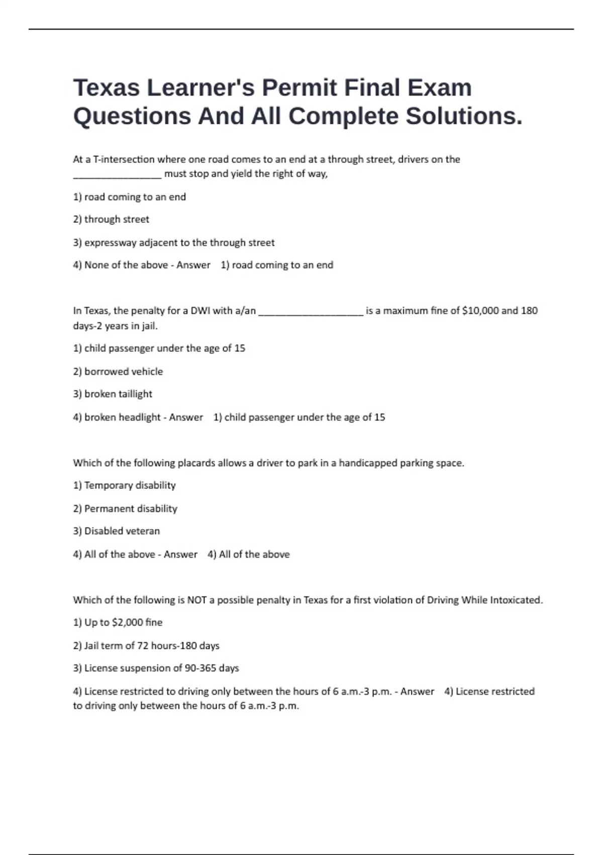 At a T-intersection where one road comes to an end at a through street, drivers on the ________________ must stop and yield the right of way, 1) road coming to an end 2) through street 3) expressway adjacent to the through street 4) None of the above - Answer 1) road coming to an end In Texas, the penalty for a DWI with a/an ___________________ is a maximum fine of $10,000 and 180 days-2 years in jail. 1) child passenger under the age of 15 2) borrowed vehicle 3) broken taillight 4) broken headlight - Answer 1) child passenger under the age of 15 Which of the following placards allows a driver to park in a handicapped parking space. 1) Temporary disability 2) Permanent disability 3) Disabled veteran 4) All of the above - Answer 4) All of the above Which of the following is NOT a possible penalty in Texas for a first violation of Driving While Intoxicated. 1) Up to $2,000 fine 2) Jail term of 72 hours-180 days 3) License suspension of 90-365 days 4) License restricted to driving only between the hours of 6 a.m.-3 p.m. - Answer 4) License restricted to driving only between the hours of 6 a.m.-3 p.m.